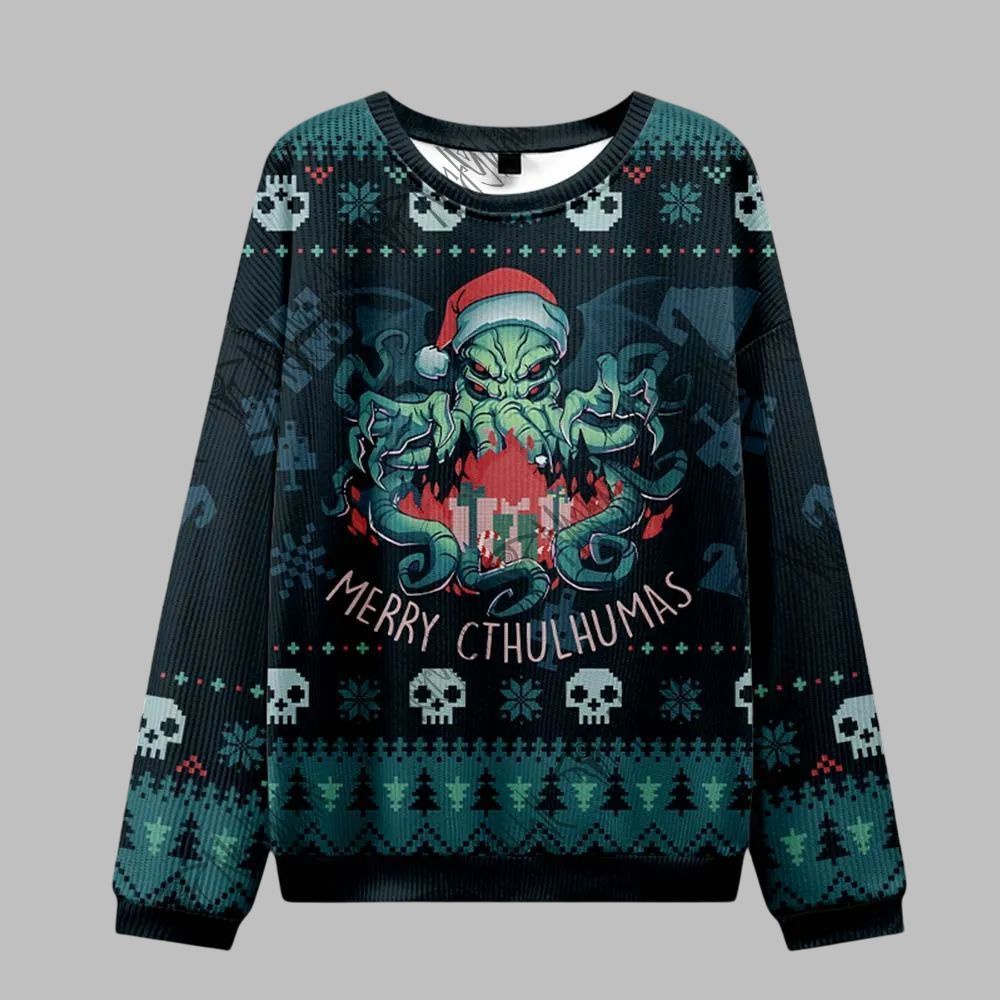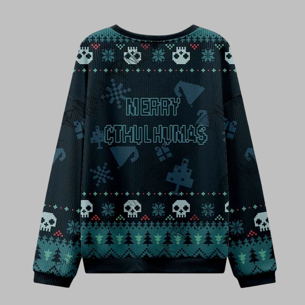 The design features the Great Old One himself, the mighty Cthulhu, rising from the depths, not to wreak havoc, but to spread a very different kind of holiday spirit. Sporting a surprisingly festive Santa hat, Cthulhu clutches a glowing gift, leaving you to wonder what otherworldly present lies within. The phrase “Merry Cthulhumas” is emblazoned below in a bold, eye-catching font, ensuring no one mistakes your allegiance. The sweater is adorned with a captivating pattern of pixelated skulls, eerie Christmas trees, and intricate snowflakes, creating a perfect fusion of traditional ugly sweater aesthetics and dark, nerdy fantasy.