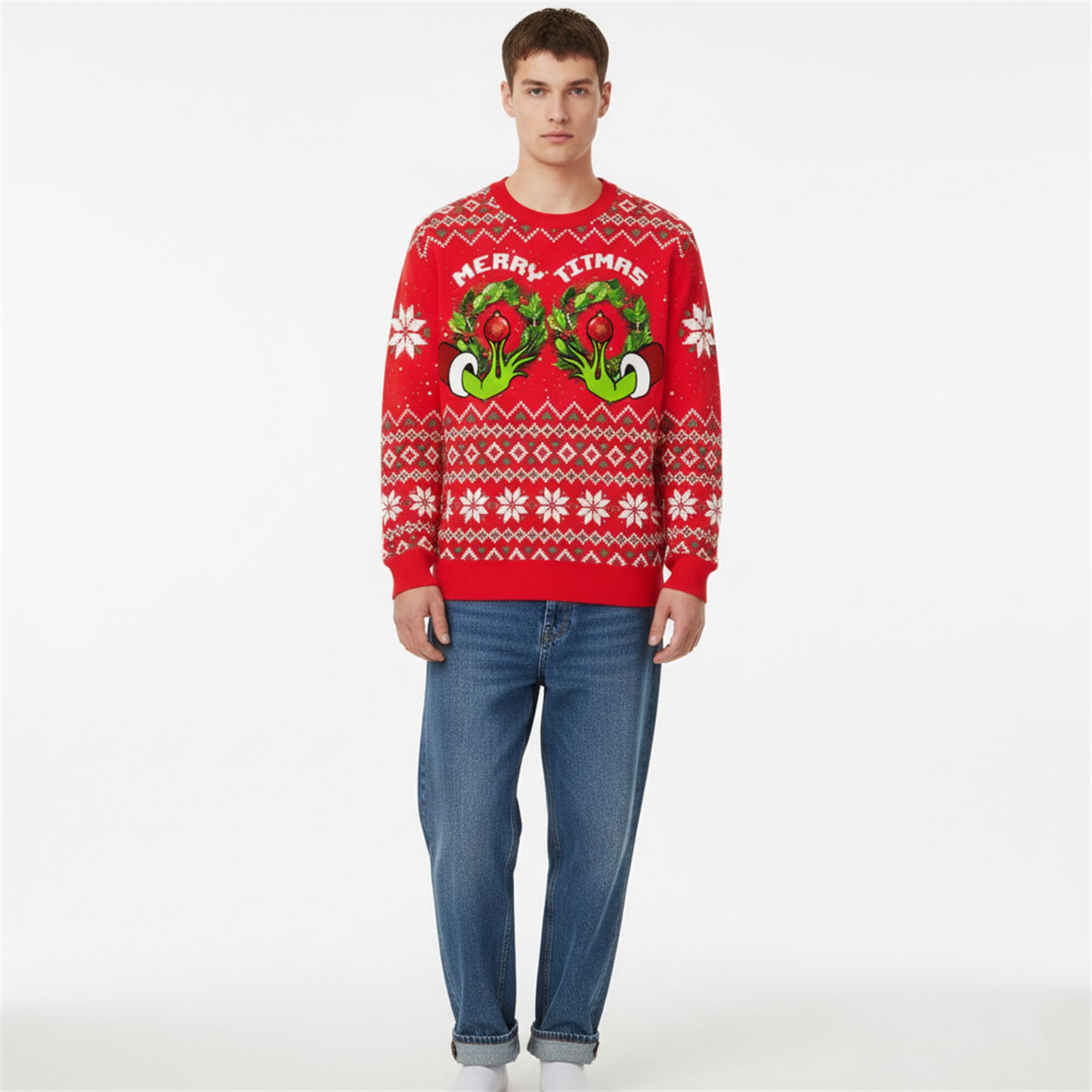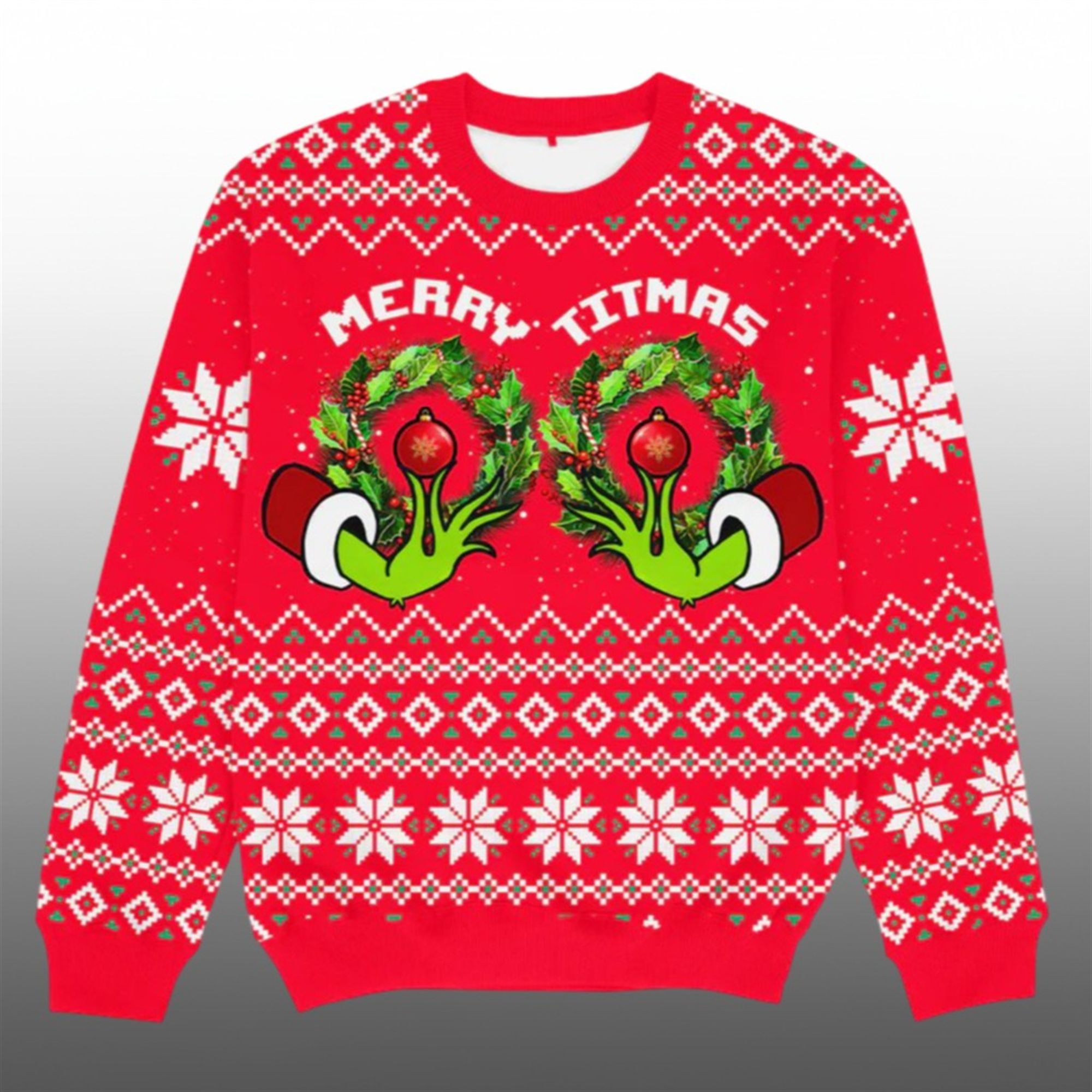 The design features a vibrant, blood-red backdrop adorned with classic white holiday stitching patterns, including pixelated snowflakes and diamonds. However, the centerpiece is what sets this garment apart. Two furry, lime-green hands—reminiscent of the famous holiday thief who tried to steal Christmas—are depicted reaching out from wreaths to hold two bright red baubles. Above this hilarious graphic, the text “MERRY TITMAS” is emblazoned in a bold, snowy font. It is a playful, risqué play on words that balances the line between naughty and nice perfectly.
