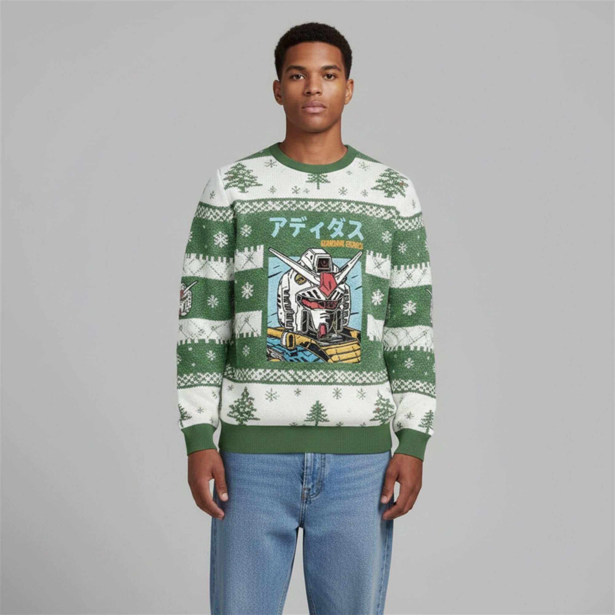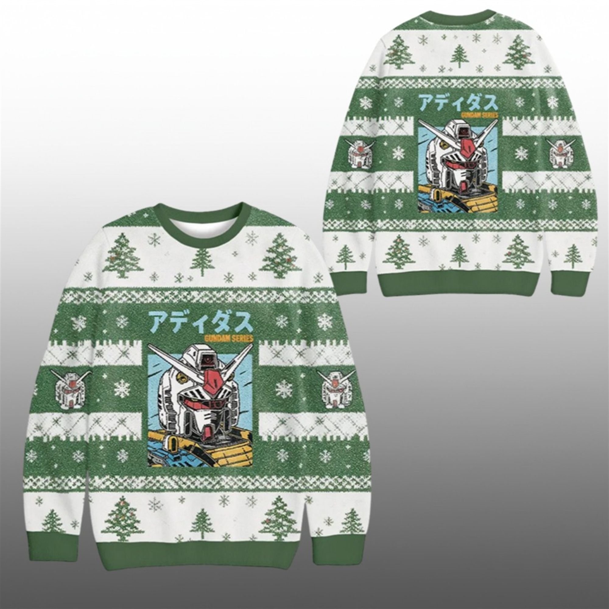 This isn’t your grandmother’s knitted sweater—it is a high-definition, all-over print masterpiece that captures the spirit of the holidays through the lens of classic mecha anime. The design features a striking central graphic of the original RX-78-2 Gundam, the mobile suit that launched a franchise. Surrounding the mech is a “faux-knit” pixelated pattern of Christmas trees, snowflakes, and geometric bands in a classic forest green and white colorway, giving you that authentic “ugly sweater” look without the itchy wool.