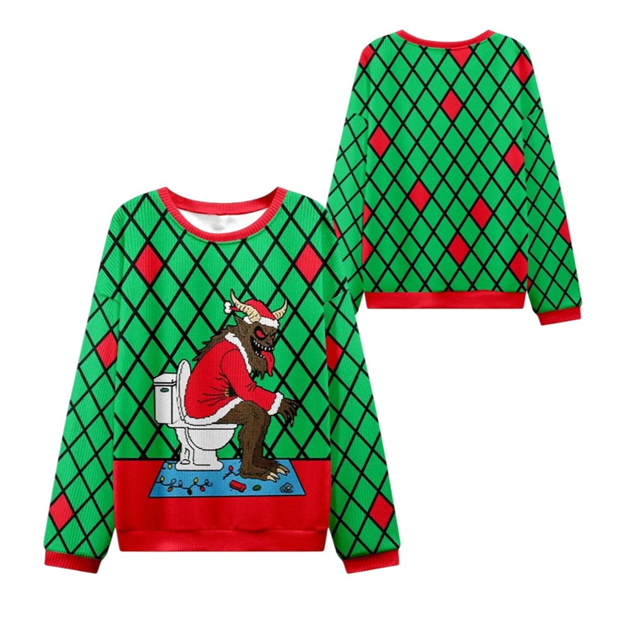 Forget gentle snowfall and cheerful carols; this sweater celebrates the chaotic, hilarious side of Christmas. Set against a vibrant green and red argyle pattern, the design features a festive, horned monster—looking suspiciously like Krampus after a few too many Christmas cookies—taking a well-deserved, private moment on a toilet. Surrounded by a festive blue rug and a tangled string of Christmas lights, this yuletide beast is here to help you win every ugly sweater contest and be the undisputed king of the holiday party. This sweatshirt is your ticket to becoming a legend, crafted for those who laugh loudly and celebrate boldly.