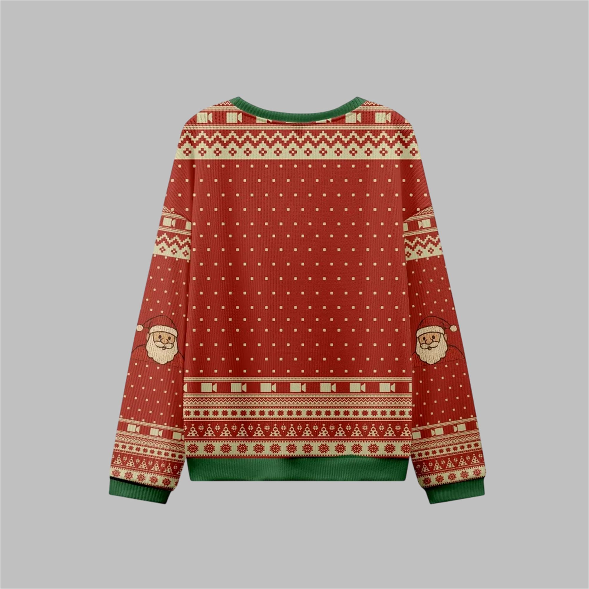 The front of the sweater showcases a classic video conference grid, featuring nine beloved holiday figures. You’ll find Santa Claus looking jolly, a cool penguin with sunglasses, a hard-working elf, a friendly snowman, Mrs. Claus, a cheerful reindeer, and more, all in their own virtual windows. Hovering above them all is the iconic phrase every remote worker knows and loves: “MUTE ALL.” This clever, timely design makes it the perfect gag gift for coworkers, tech-savvy friends, or any family member who has ever hosted a chaotic virtual family chat.