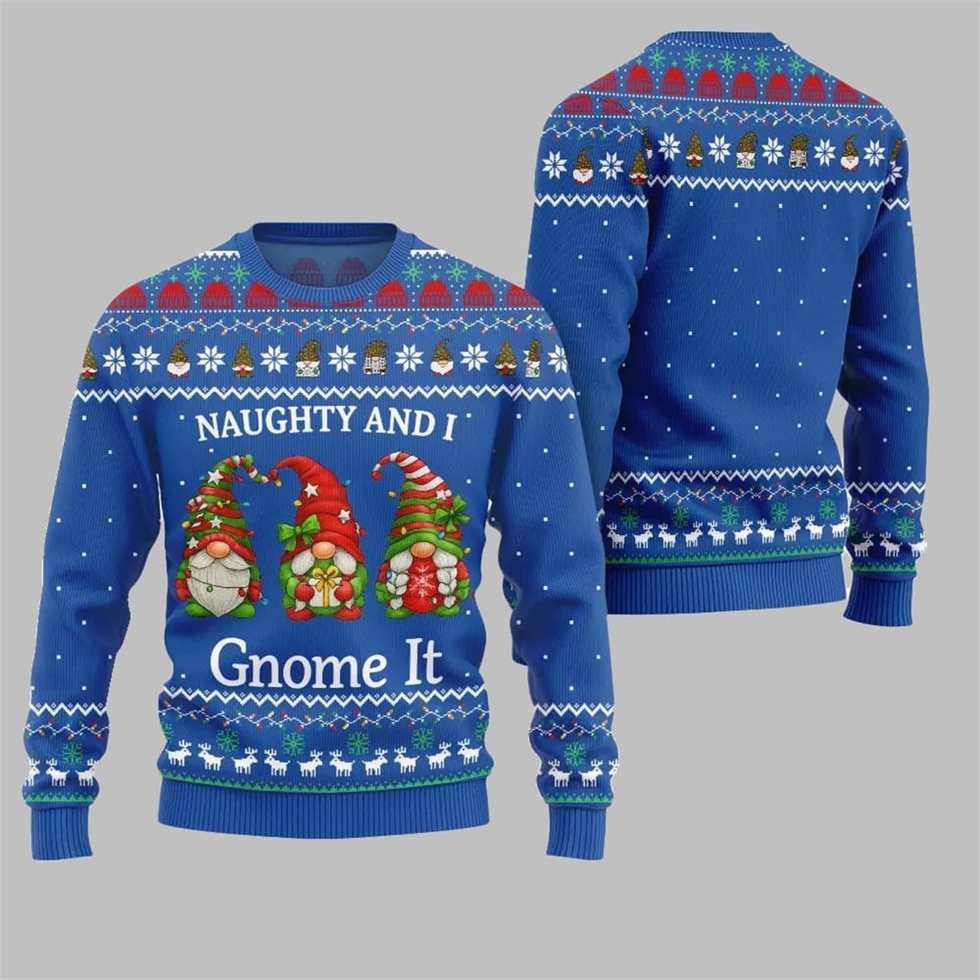 The design features a trio of delightfully mischievous gnomes, each decked out in unique holiday hats and holding tiny gifts, fully embracing their spot on the naughty list. Set against a vibrant, holly-red backdrop, the bold white text delivers a clever pun that’s impossible to ignore. This isn’t just a piece of clothing—it’s a wearable piece of holiday humor that captures the joyful, carefree spirit of the season. The intricate, Nordic-inspired patterns of snowflakes, reindeer, and Christmas trees along the sleeves and shoulders complete the classic “ugly sweater” look while maintaining a high-quality, visually appealing aesthetic.