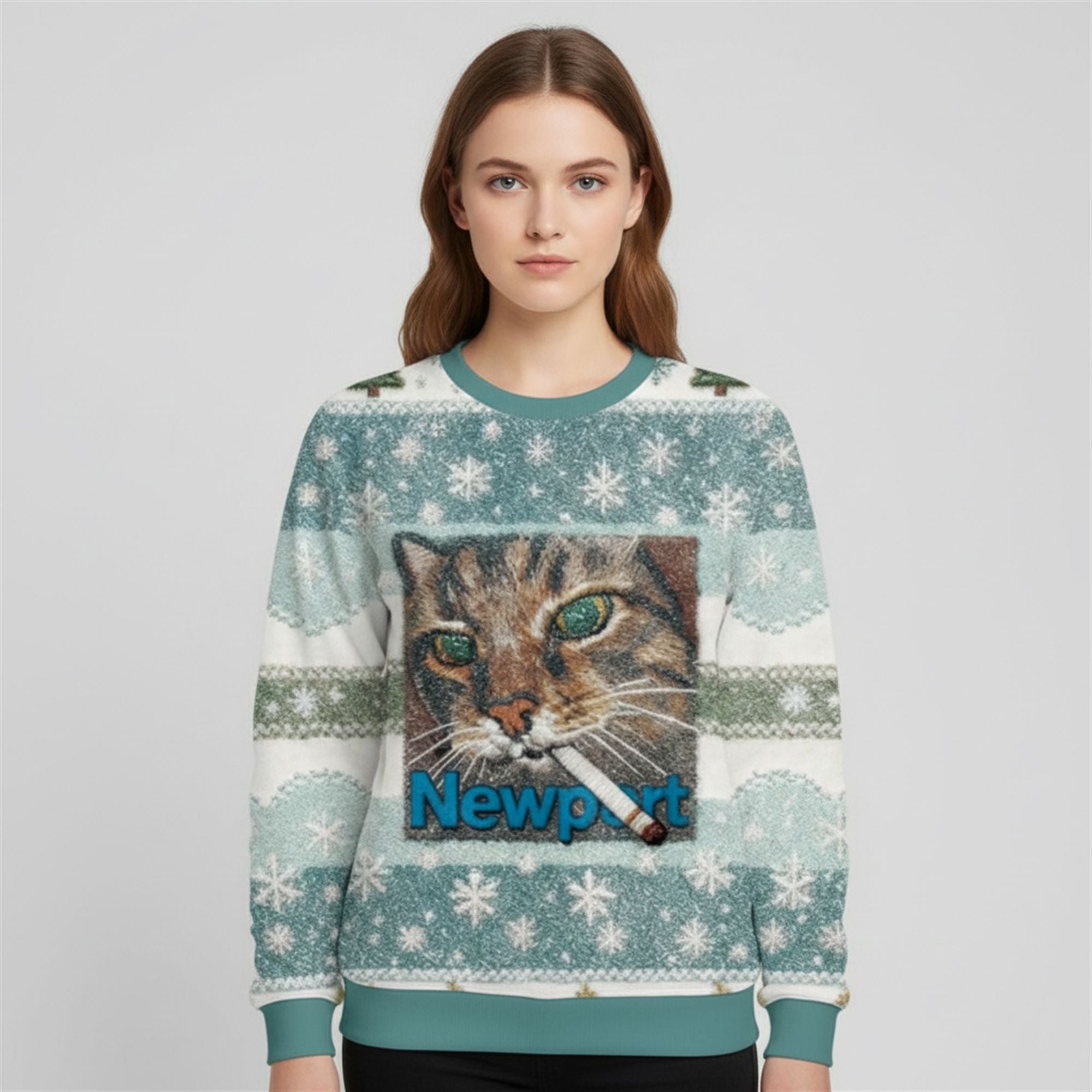 The 2025 Christmas Newport Cat Ugly Sweater is not just a piece of clothing; it is a wearable piece of internet history. This sweater captures the essence of the “Newport Cat” meme—a beloved image of a rough-around-the-edges tabby cat with a cigarette, humorously photoshopped to mimic the branding of Newport cigarettes.