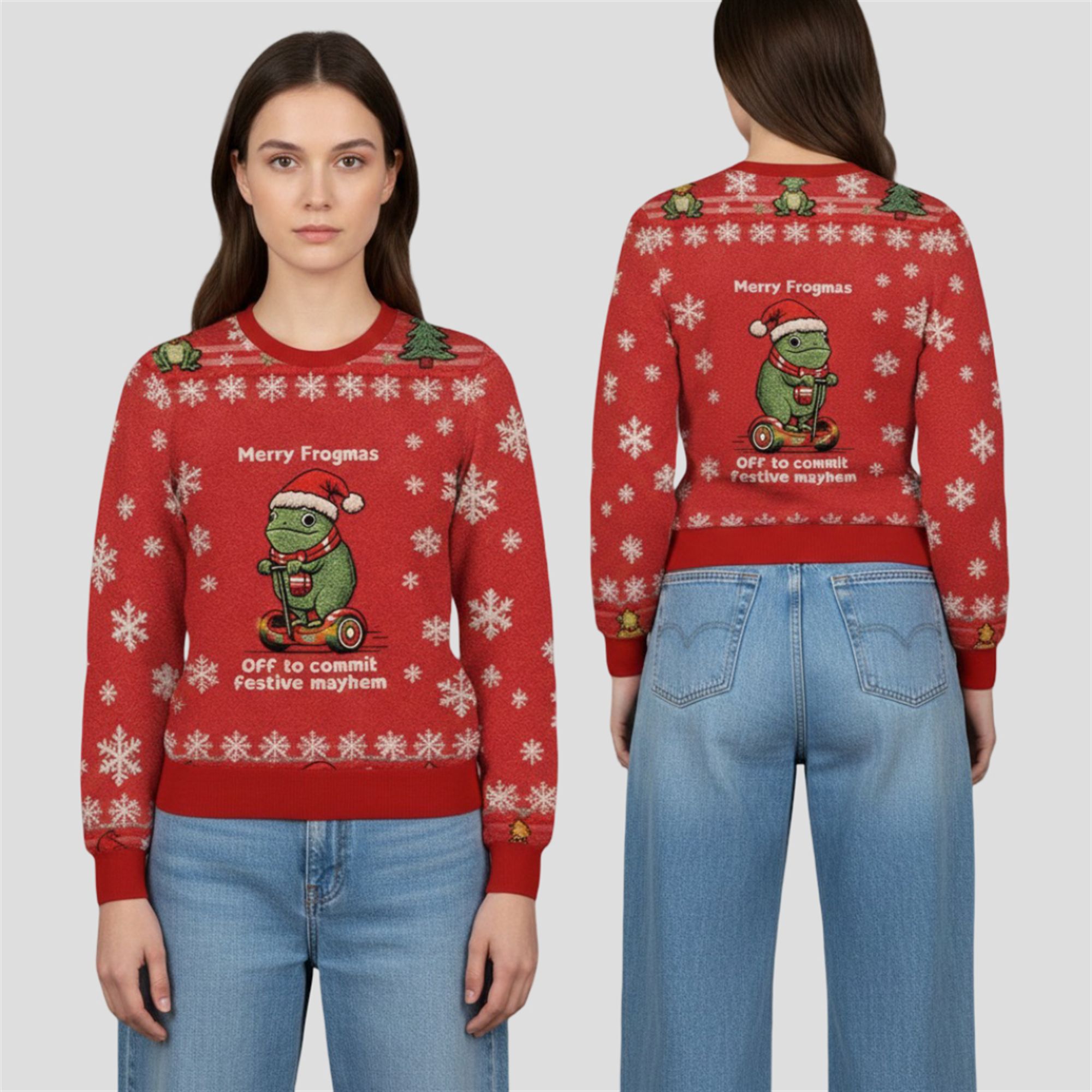 The Christmas season is usually about peace and joy, but let’s be honest—sometimes you just want to cause a little mayhem. The sweater captures that exact mood. This isn’t just a piece of clothing; it’s a statement piece for the “chronically online” generation. The design features a charmingly illustrated green frog riding a red scooter, explicitly captioned with the intent to cause “Frogmas Mayhem.” It playfully subverts traditional holiday tropes, replacing silent nights with the promise of festive shenanigans.