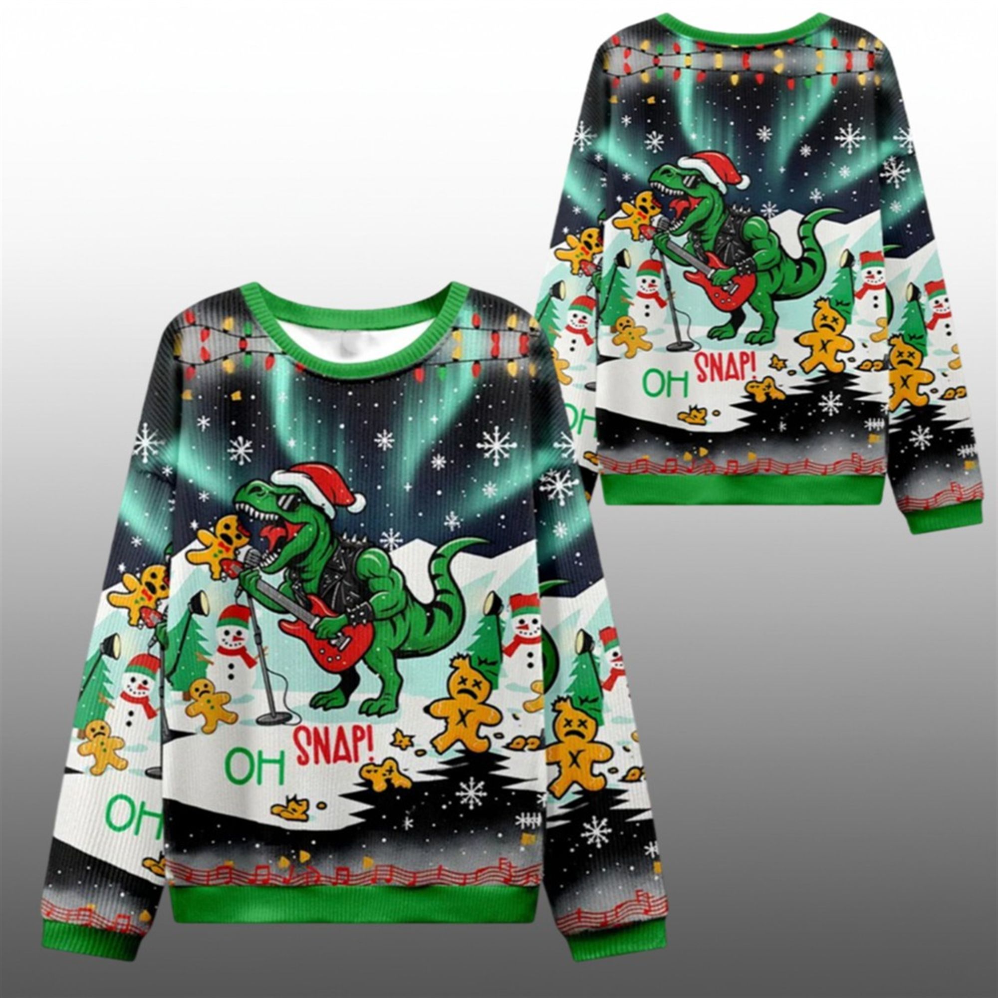 But the real punchline lies in the details. The phrase “OH SNAP!” is emblazoned across the bottom, referencing the unfortunate fate of the gingerbread man whose head has just been snapped off by our reptilian rock god. Surrounded by terrified gingerbread backup dancers and snowmen spectators under a vibrant Aurora Borealis sky, this sweater is a visual masterpiece of chaos and comedy. It captures the wild energy of the season, making it the perfect conversation starter for any gathering.