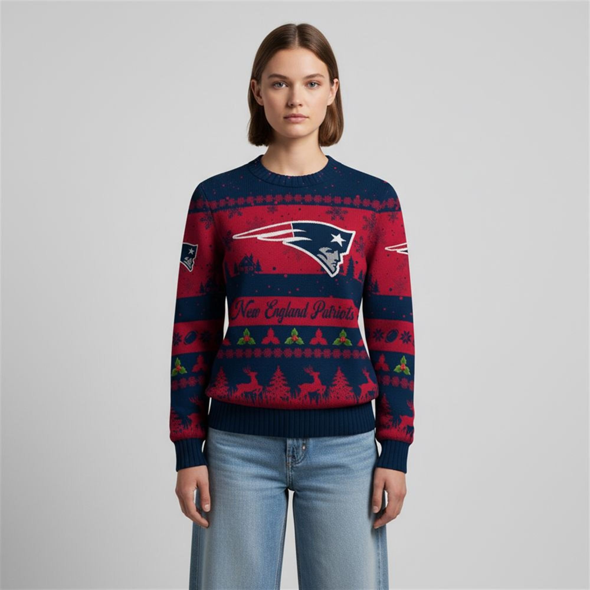The design is anchored by the massive Patriots logo centered proudly on the chest, surrounded by bands of festive imagery. Rows of silhouette reindeer, snow-covered evergreen trees, and delicate snowflakes dance across a backdrop of deep navy and vibrant red. The script “New England Patriots” is woven prominently across the midsection, ensuring there is no mistake about where your allegiance lies.