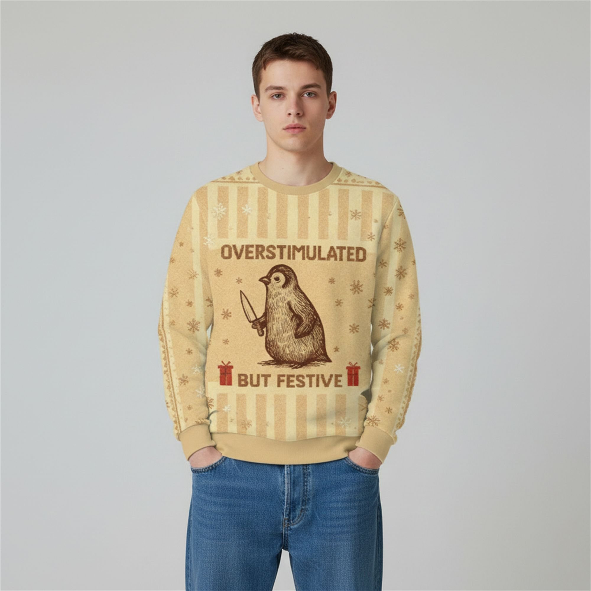Step aside, traditional reindeer patterns. The breakout star of Christmas 2025 is a chaotic, flightless bird. Our Overstimulated But Festive Ugly Christmas Sweater taps into the viral “unhinged holiday” aesthetic that is taking over social media.