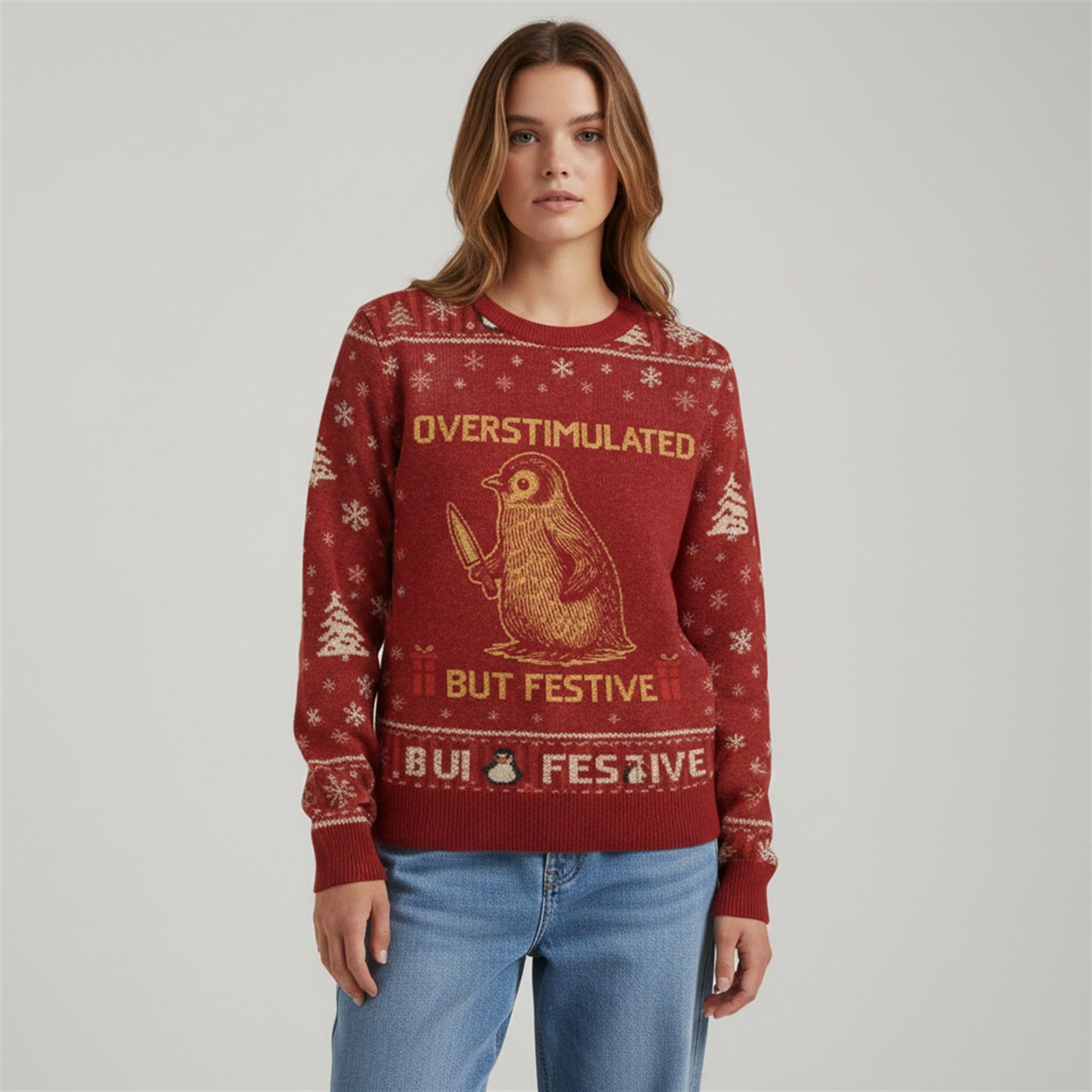 The design features a brilliant juxtaposition that defines modern internet humor. On the surface, it looks like a classic holiday garment with a deep red background, faux-stitch borders, falling snowflakes, and festive pine trees. But the centerpiece tells a different story: a detailed, woodcut-style illustration of a penguin looking wide-eyed and unhinged, gripping a knife. Flanked by the text “OVERSTIMULATED BUT FESTIVE,” this sweater validates everyone who is trying their best to keep it together while the holiday madness swirls around them.