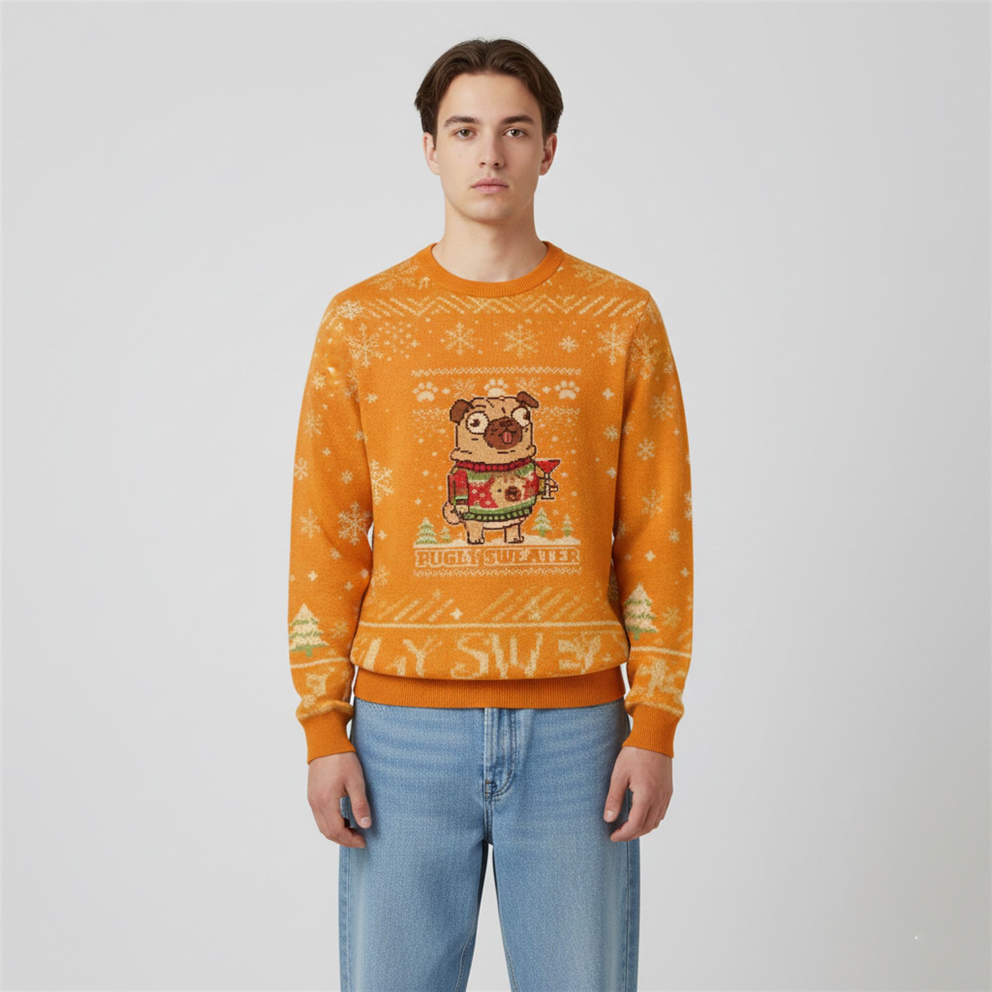 The design is set against a striking bright orange background, a unique departure from the standard red and green holiday palette, ensuring you stand out in photos. The background features a faux-knit distinct pixelated pattern complete with snowflakes, pine trees, and paw prints, giving it that nostalgic, vintage sweater aesthetic without the itchiness of real wool. The text “PUGLY SWEATER” is emblazoned across the bottom, delivering the punchline that everyone will appreciate.