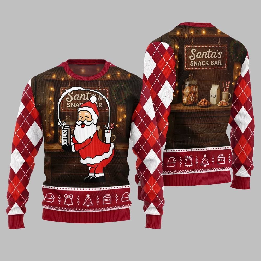 The front proudly displays a delightfully rendered, pixelated Santa, joyfully holding a carton of milk and a plate of cookies, standing in front of his very own “Santa’s Snack Bar” sign. The attention to detail is remarkable, from the festive string lights illuminating his snack haven to the subtle, charming argyle pattern on the sleeves, blending traditional holiday colors of red, green, and white. The back of the sweater continues the narrative, showcasing Santa’s well-stocked snack bar, brimming with tempting cookies and milk, ready for replenishment. This cohesive design tells a story, making the sweater more than just an item of clothing – it’s a wearable piece of holiday art.