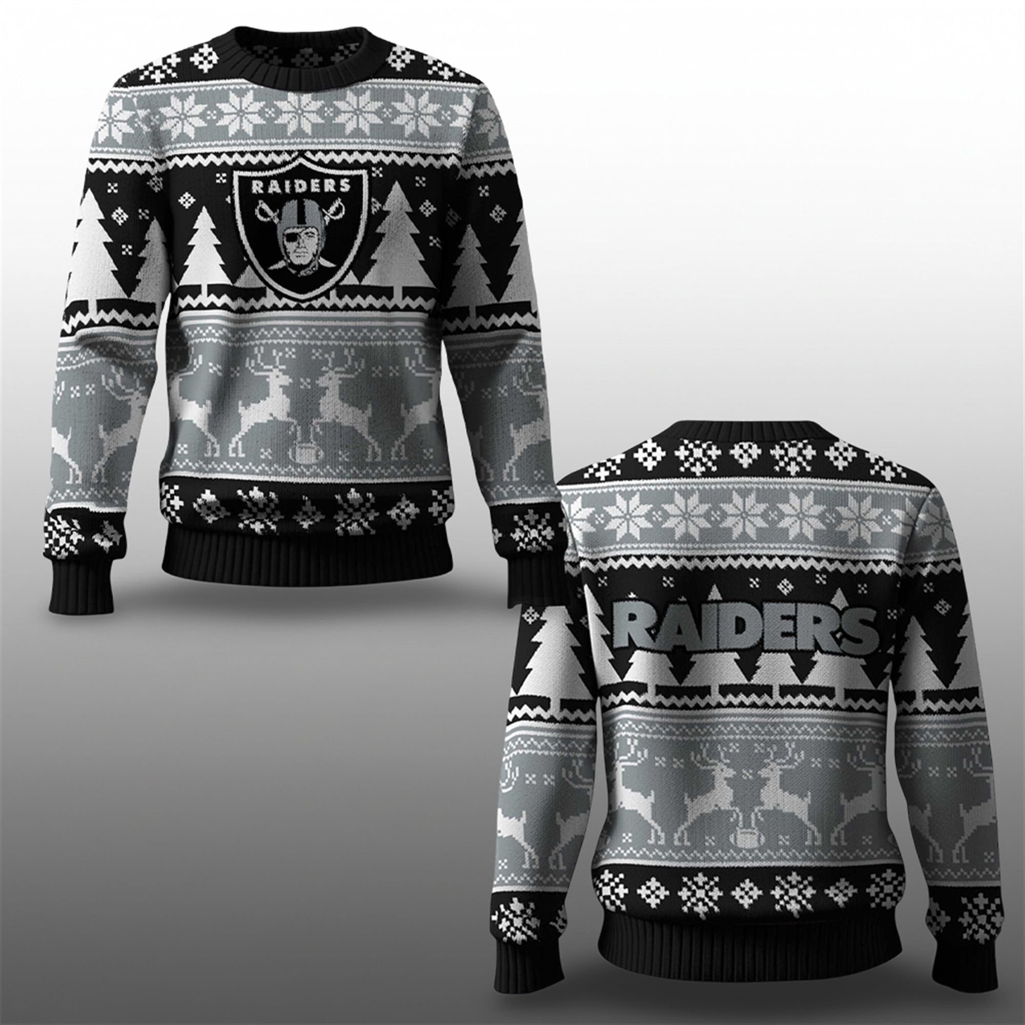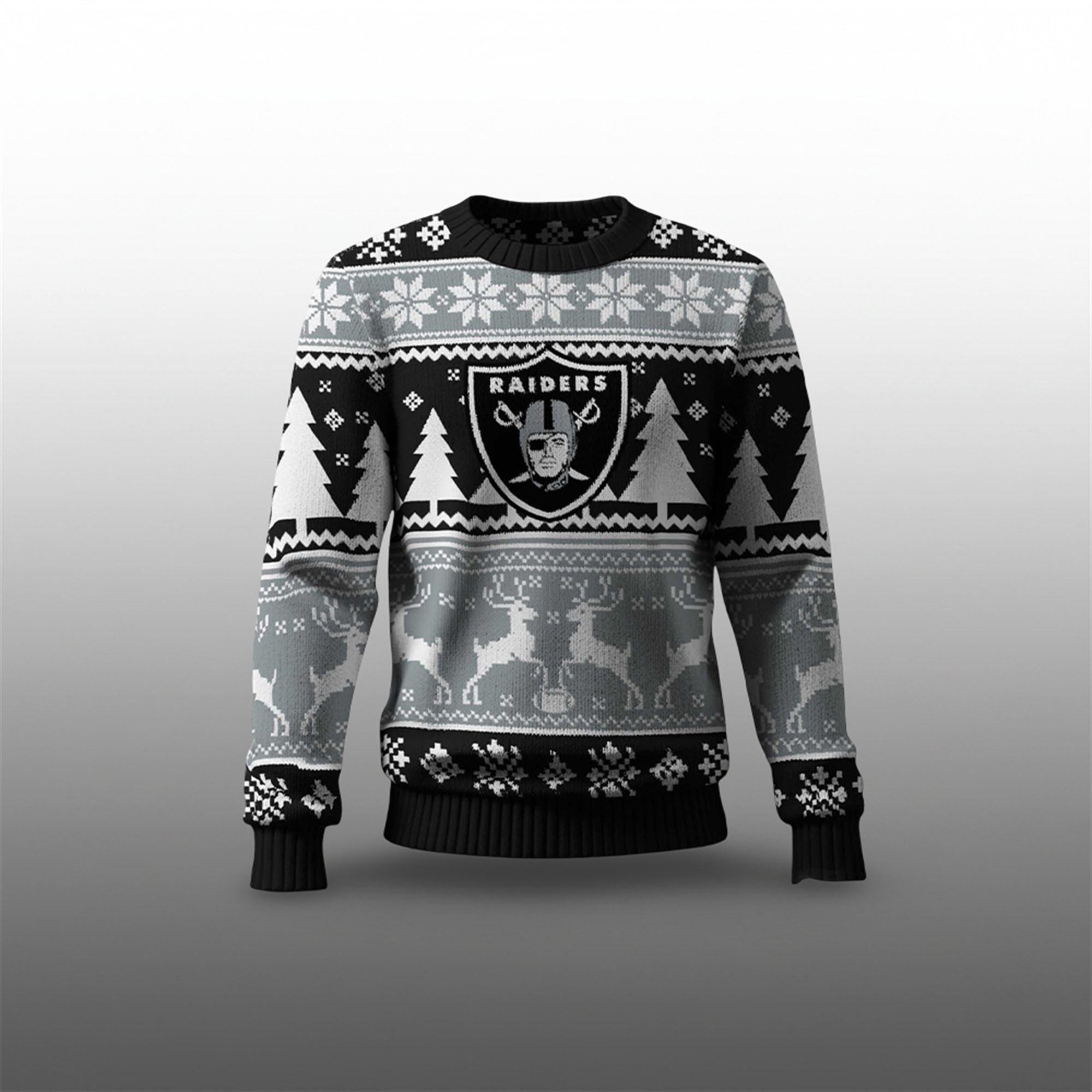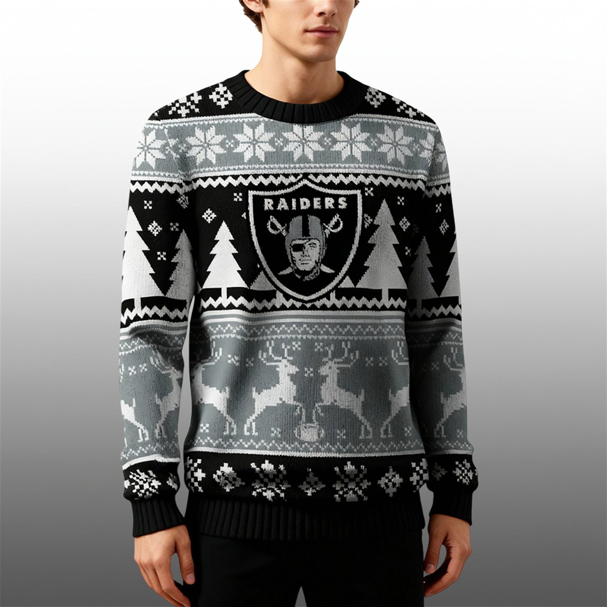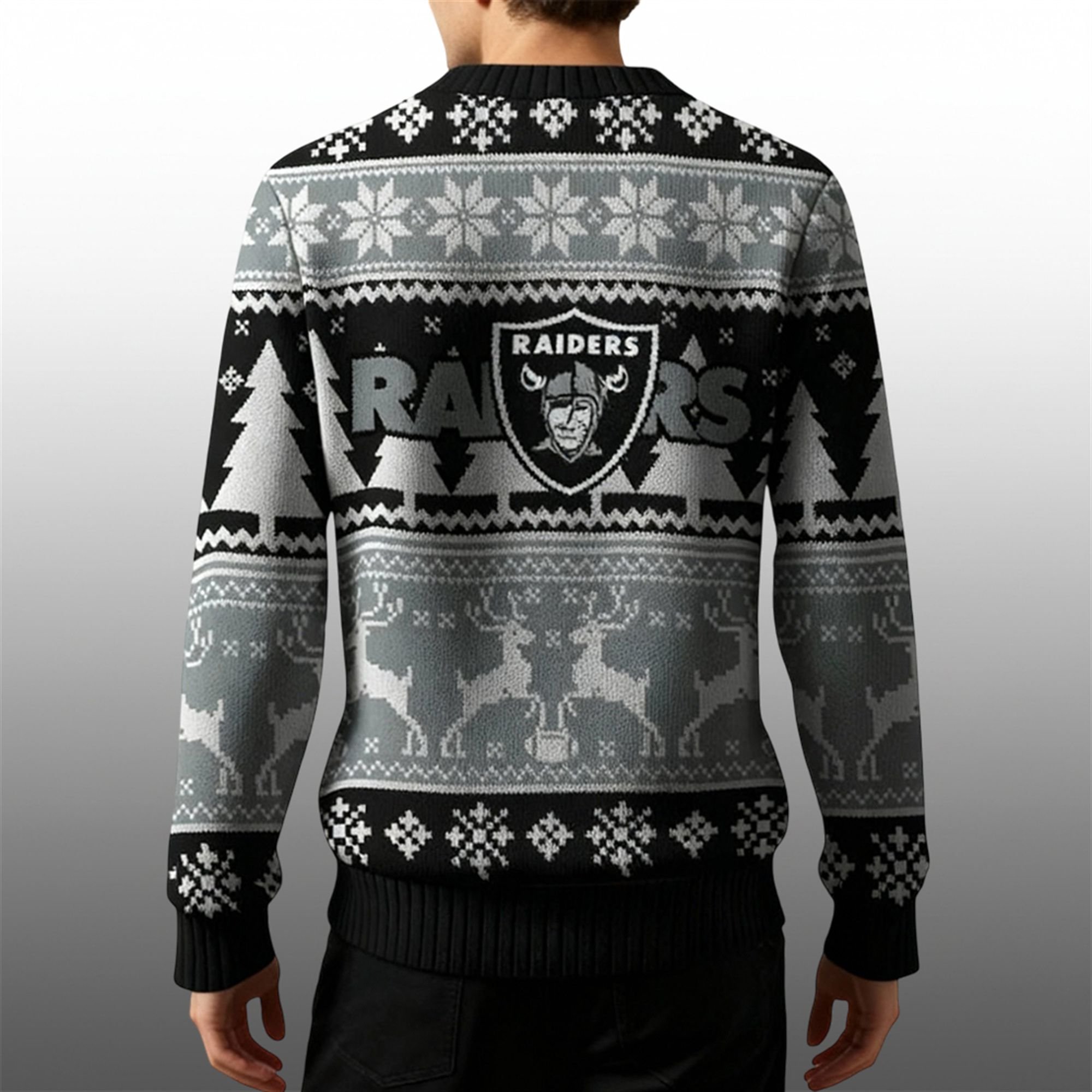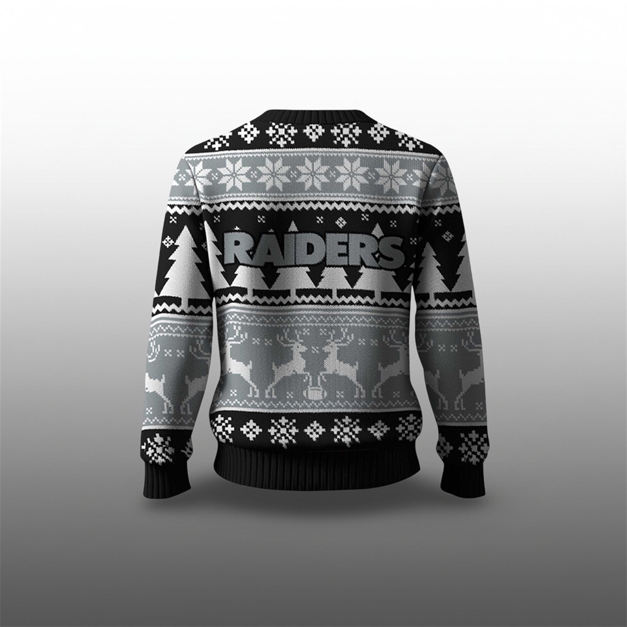 This isn’t just another piece of fan apparel; it’s your new holiday uniform. The design is a masterful mix of Raiders pride and festive cheer. Crafted in the team’s signature black, silver, and white, the pattern features everything you need for the holidays. Galloping reindeer, festive snowflakes, and rows of Christmas trees create a classic “ugly sweater” vibe, while the bold, unmistakable Raiders shield logo is proudly emblazoned on the chest.