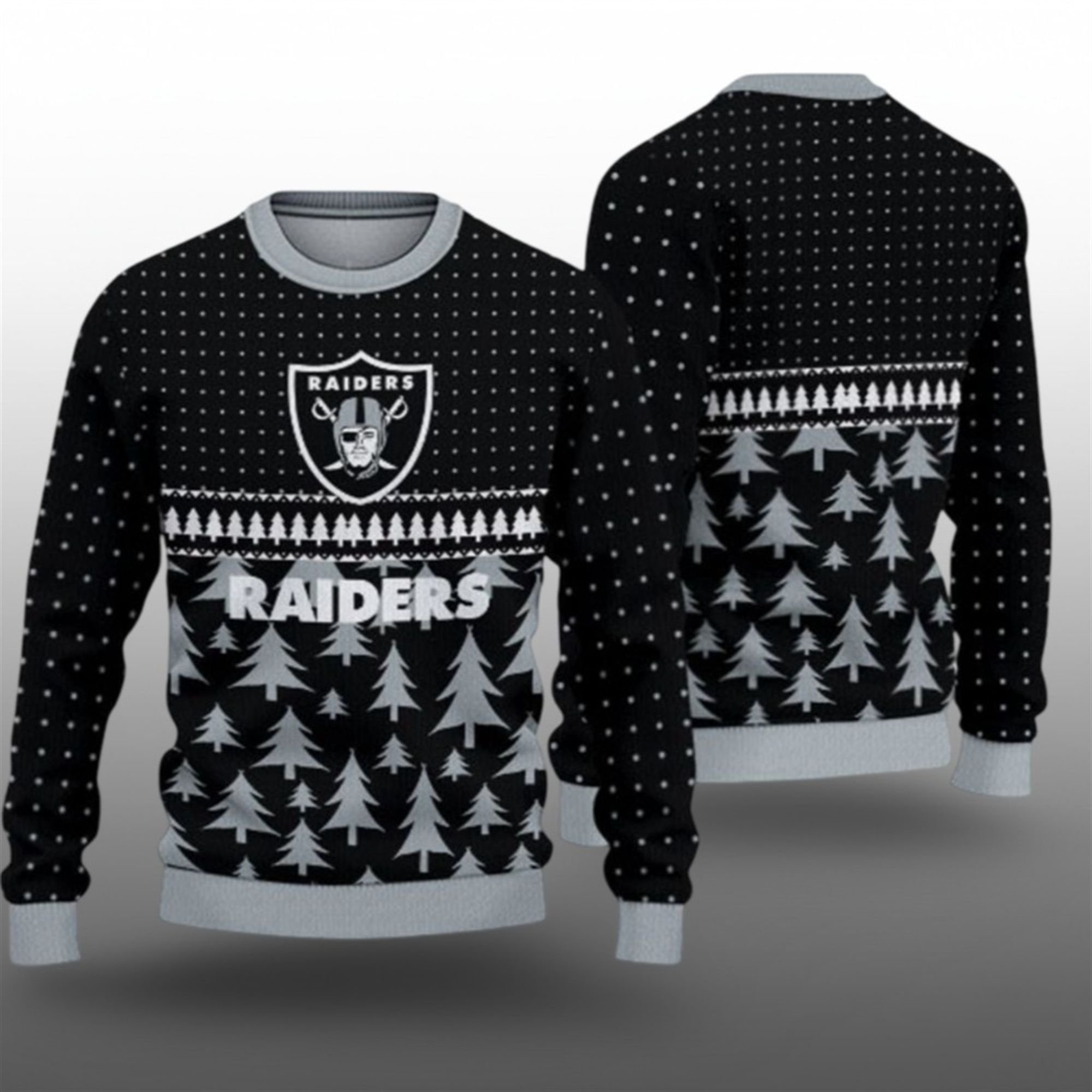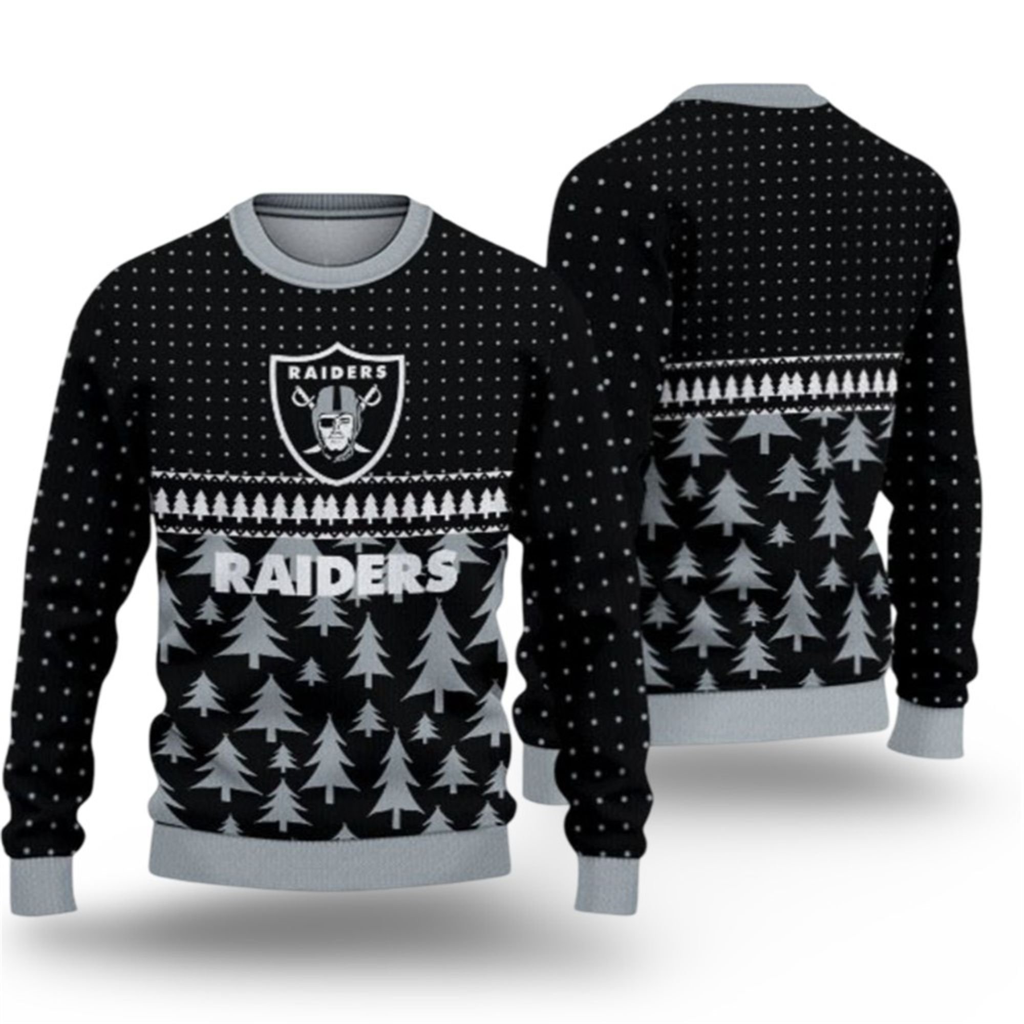 In a sea of generic holiday apparel, this sweater stands apart. The design is a sophisticated take on the “ugly sweater” trend, featuring a bold, repeating pattern of winter-white Christmas trees set against the classic Raiders black. The team’s iconic wordmark is woven directly into the chest, sitting below a row of festive trees and a star-dotted pattern that mimics a winter snowfall.