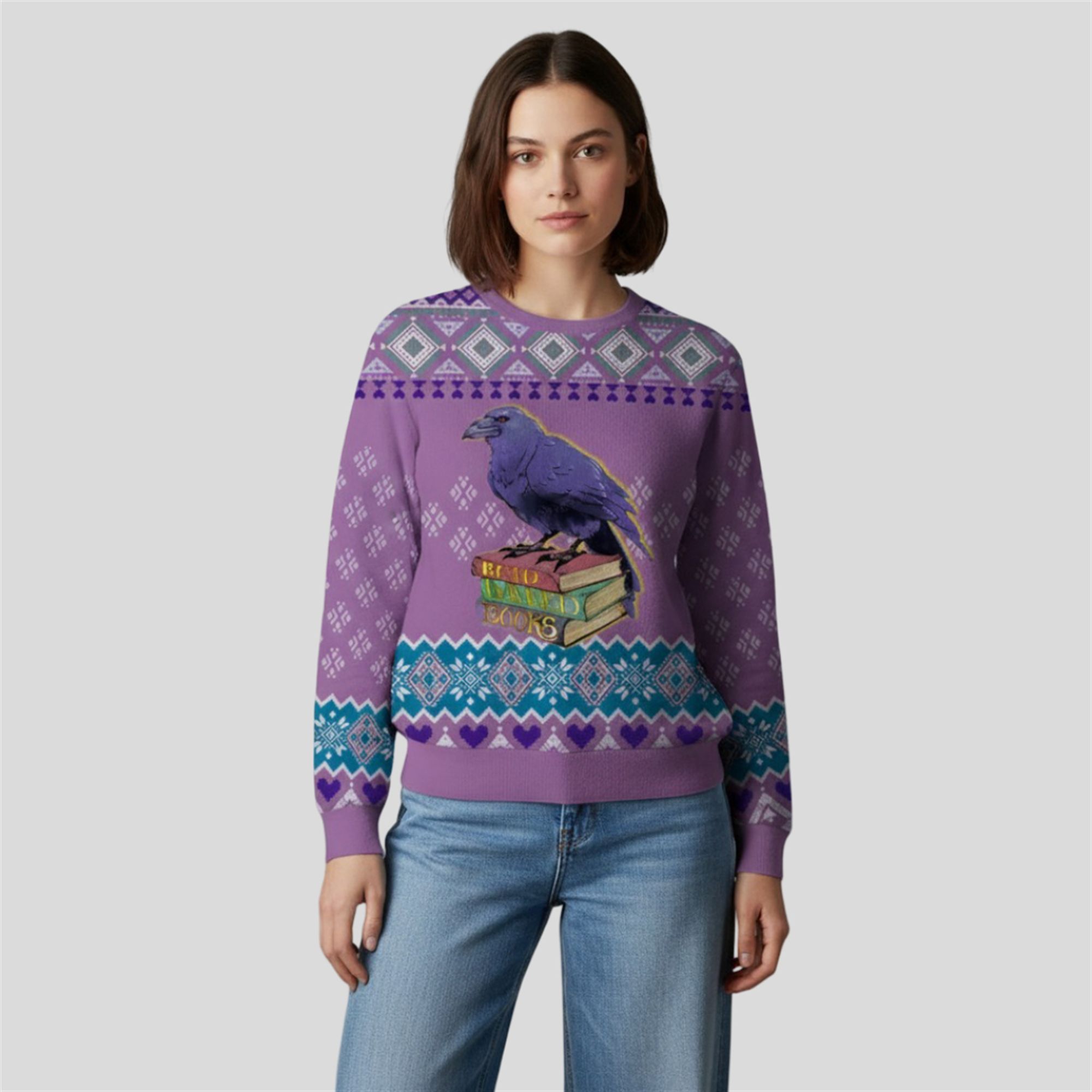 Moving away from tired clichés of reindeer and snowflakes, this unique design centers on a majestic, dark raven—a literary icon reminiscent of Edgar Allan Poe’s mysterious works. The raven stands guard over a colorful stack of “Banned Books,” symbolizing the protection of knowledge and the power of stories that challenge the status quo. Set against a rich, royal purple background, the design is framed by traditional Fair Isle patterns featuring geometric diamonds, hearts, and Nordic snowflakes, giving it that authentic “ugly sweater” charm without sacrificing style.