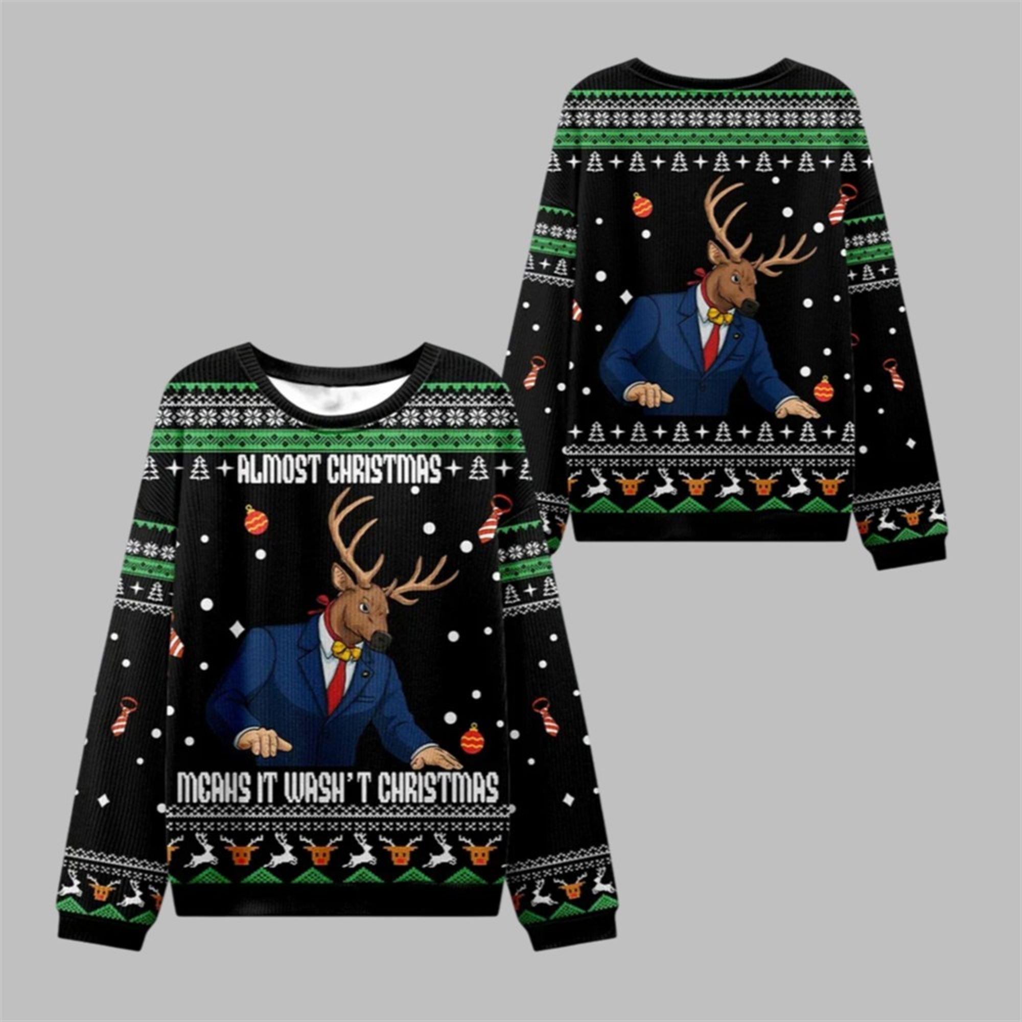 This holiday season, step away from the mundane and into the magnificent with the 2025 Christmas Reindeer Man Ugly Christmas Sweater. This one-of-a-kind sweatshirt is the perfect fusion of traditional festive cheer and contemporary meme culture, designed for the individual who loves to make an entrance. The centerpiece of this design is a hilariously sophisticated reindeer, looking sharp in a tailored blue suit and red tie, as if he’s about to close a major North Pole business deal. This comical image is brilliantly framed by the witty, circular logic of the text: “ALMOST CHRISTMAS MEANS IT WASN’T CHRISTMAS.” It’s a clever, playful phrase that’s guaranteed to spark laughter and debate at any gathering.