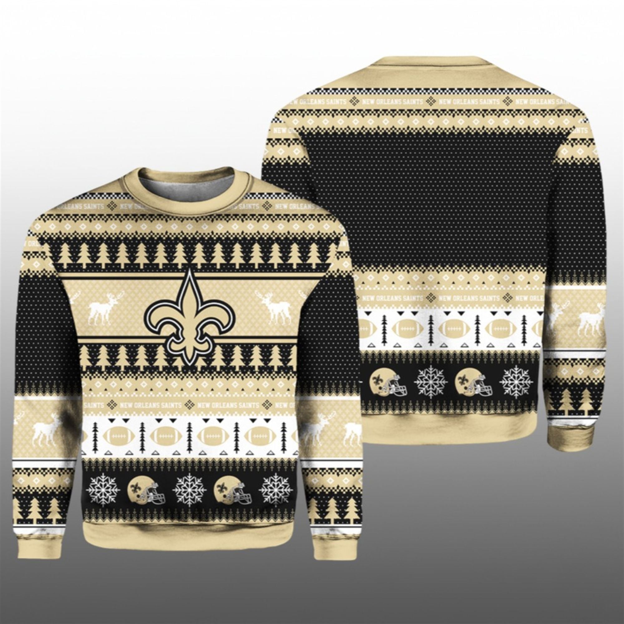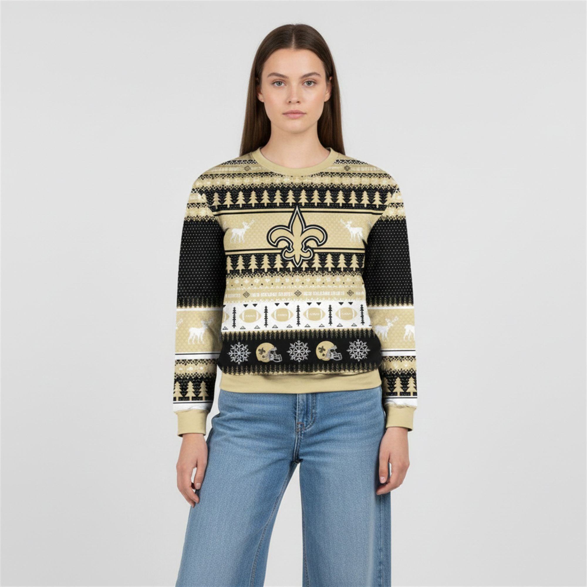 At the center lies the majestic Fleur-de-lis, the heartbeat of New Orleans, flanked by festive reindeer and winter pines. However, look closer, and you’ll see the details that true fans appreciate: rows of footballs, team helmets, and the “New Orleans Saints” wordmark integrated into the geometric borders. It is a bold declaration of fandom that stands out in a sea of generic red and green holiday wear.