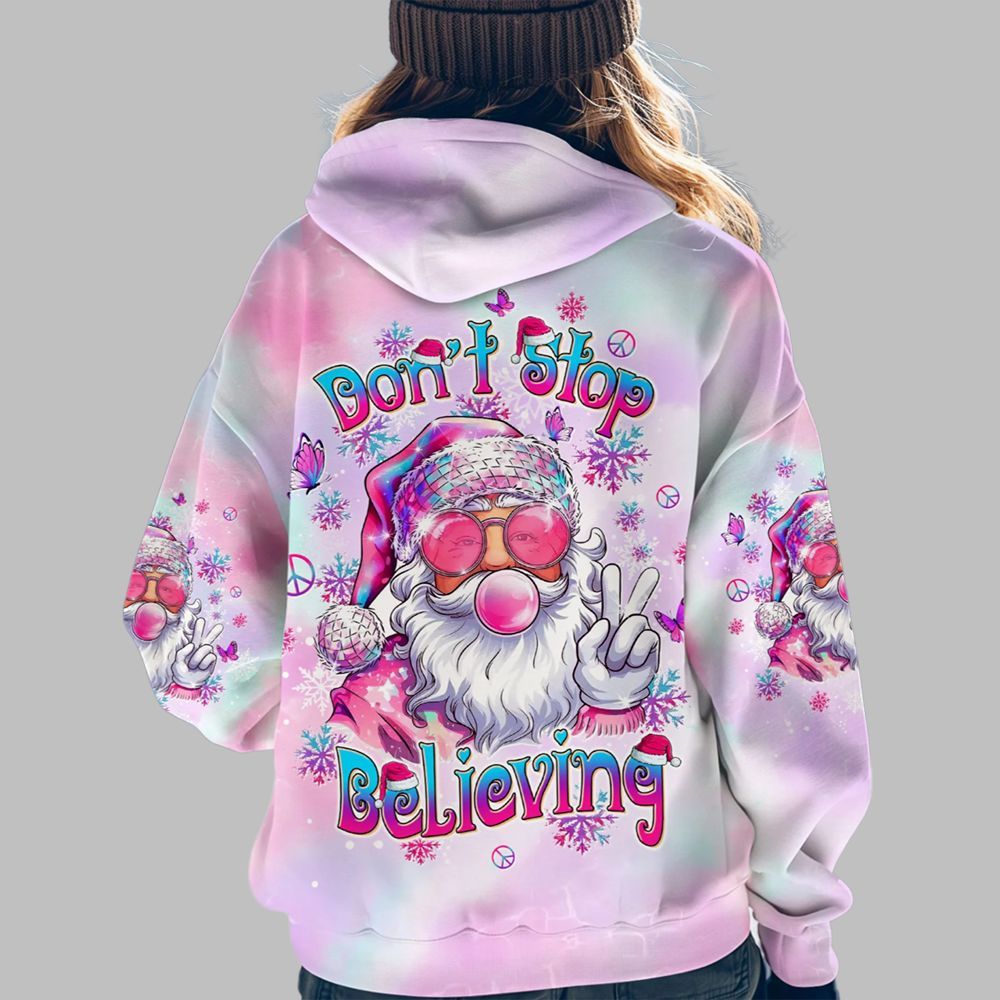 The centerpiece is a Santa Claus unlike any other—decked out in sparkling pink sunglasses, casually blowing a giant pink bubble, and offering a peace sign. His classic red hat is adorned with a funky, star-dusted pattern, all set against a dreamy pink, purple, and blue tie-dye canvas. Whimsical butterflies, delicate snowflakes, and subtle peace signs float around him, creating a magical, almost psychedelic winter wonderland. The text, rendered in a groovy, stylized font, reminds everyone of the enduring holiday anthem: “Don’t Stop Believing.”