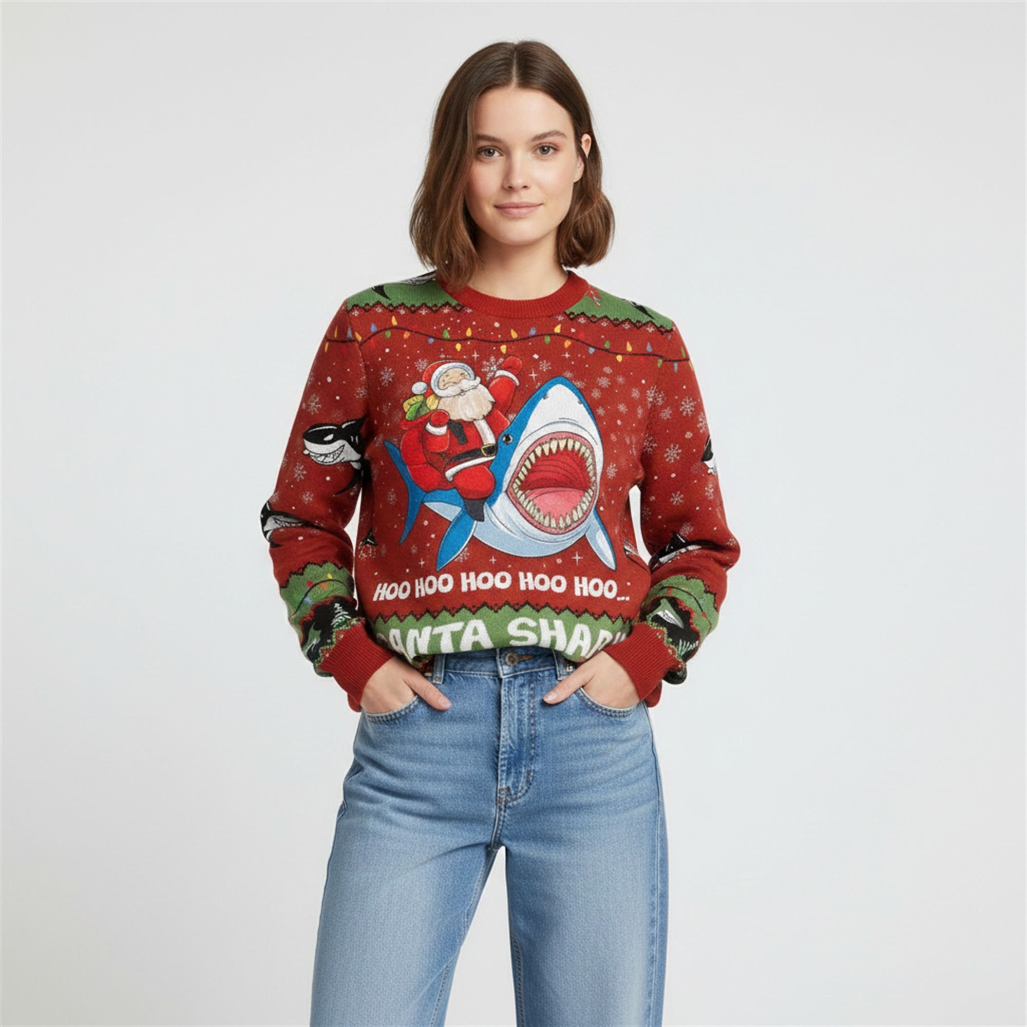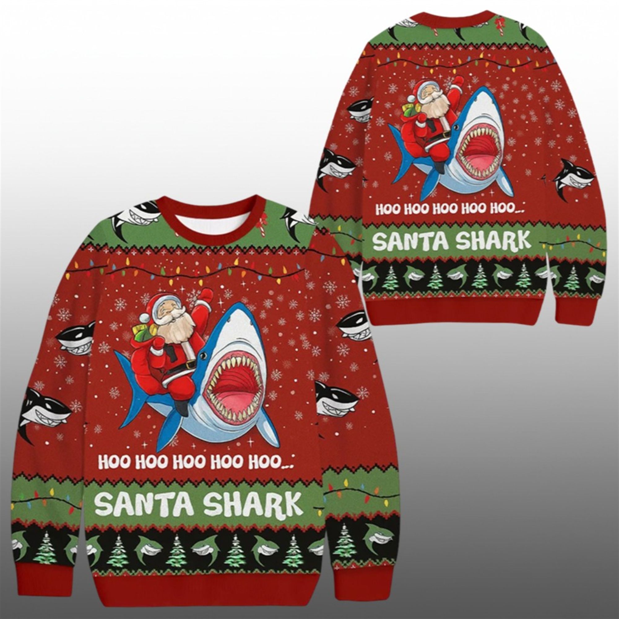 This isn’t just a piece of clothing; it’s a mood lifter. The design features a bold, all-over print on a classic red background, mimicking the pixelated “knit” look of vintage grandma sweaters but with a modern, high-definition finish. At the center, Santa Claus is depicted fearlessly riding a massive shark, complete with a saddle of presents. The text “HOO HOO HOO HOO HOO… SANTA SHARK” runs across the chest and hem, instantly invoking the melody of the world’s most viral shark song.