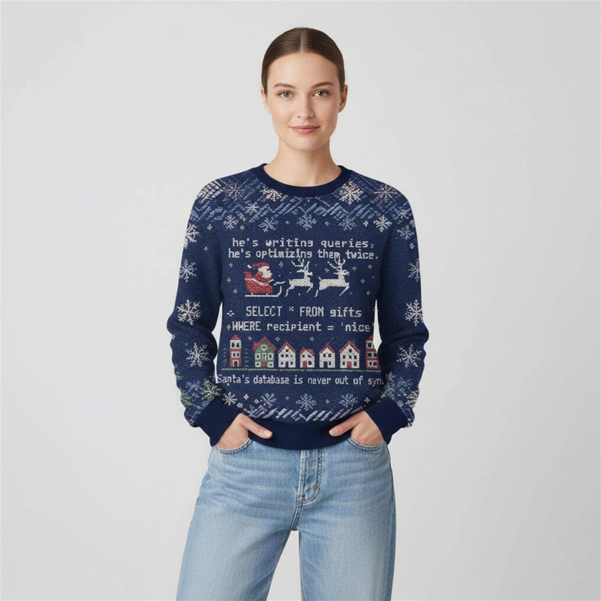 Celebrate Christmas 2025 with a garment that speaks your language—literally. The Santa’s Database Never Out of Sync Ugly Sweater is a hilarious homage to the intersection of holiday magic and database management.