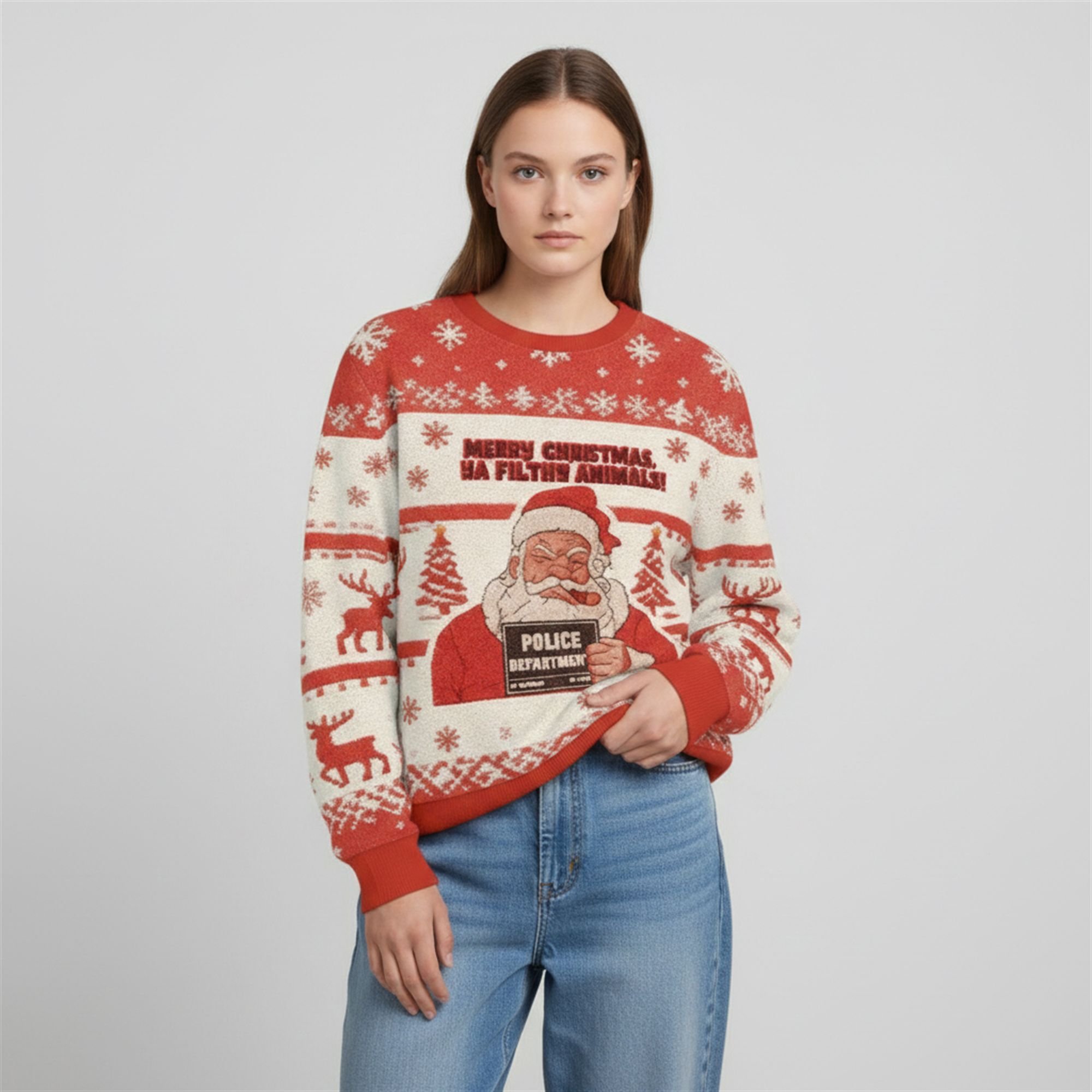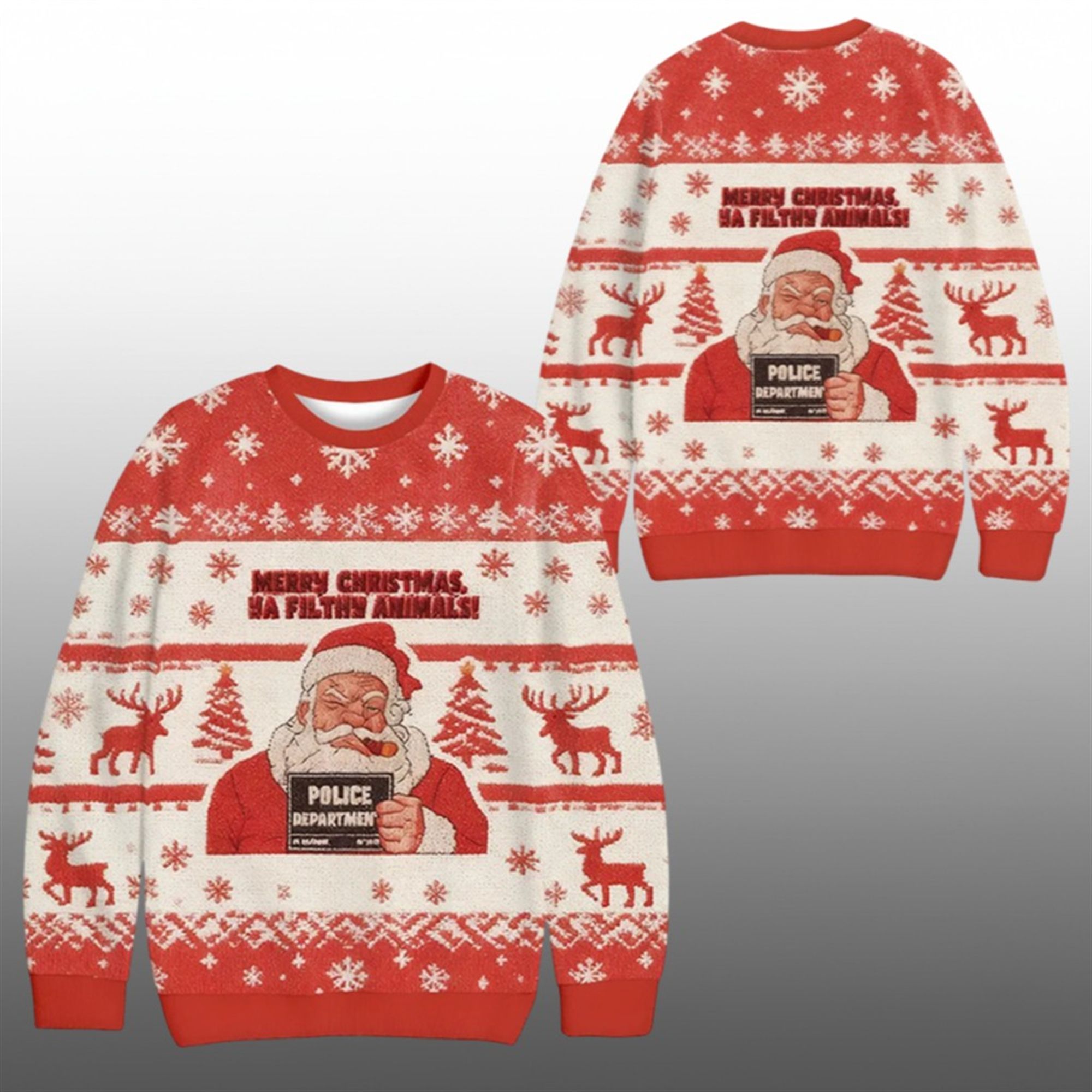 Get ready to dominate every Ugly Christmas Sweater party in 2025 with the ultimate blend of holiday nostalgia and rebellious humor. Our 2025 Christmas Santa’s Mugshot Funny Ugly Sweater takes the season’s most iconic movie quote—”Merry Christmas Ya Filthy Animal”—and pairs it with a gritty, hilarious depiction of St. Nick behind bars.
