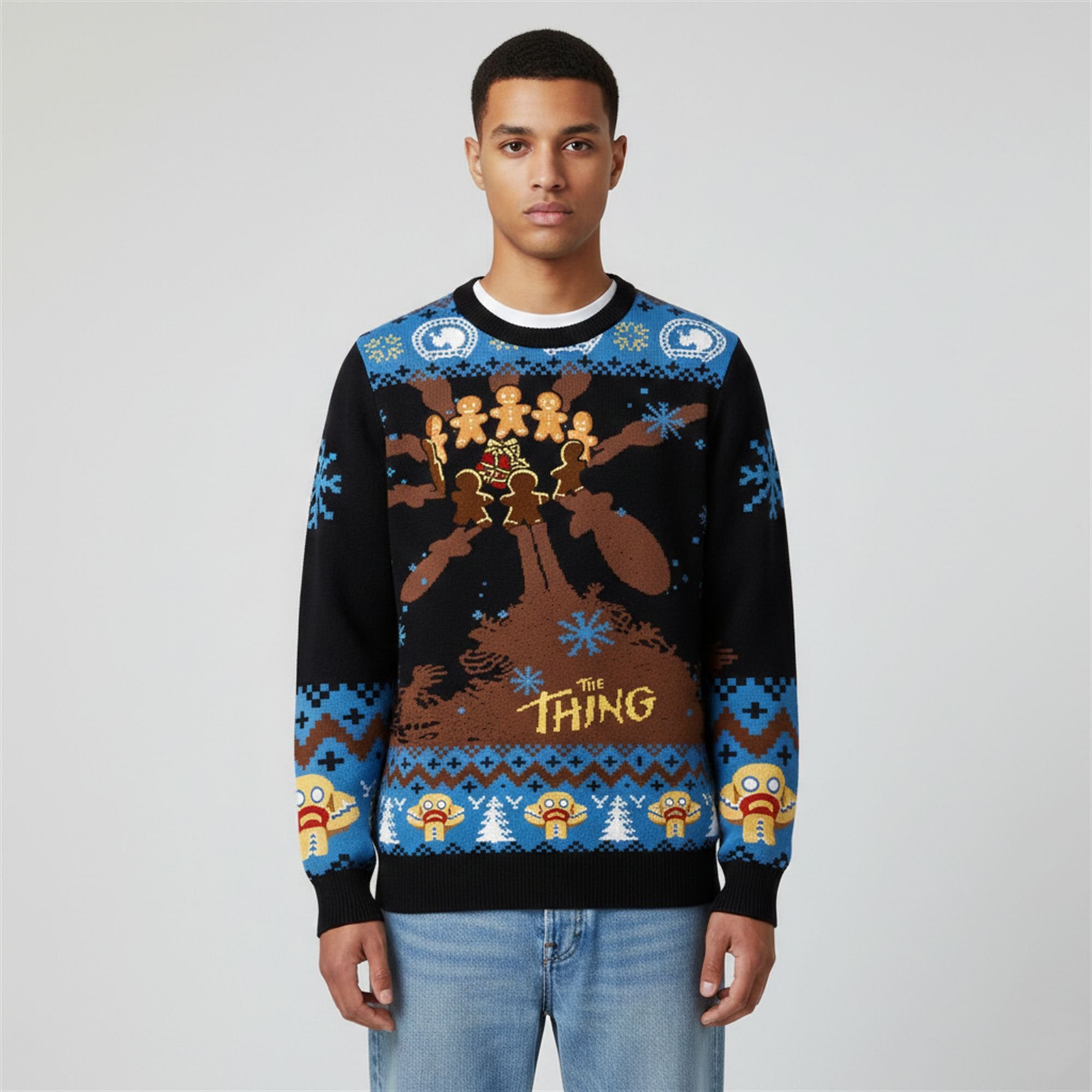Set against a backdrop of deep Antarctic black and icy blue, the design mimics traditional Nordic knitting patterns but replaces the usual snowflakes with pixelated horror elements. The bold “THE THING” typography anchors the design, signaling to every movie buff in the room that you have impeccable taste in cinema. It is the perfect convergence of scary and sweet, making it a top contender for the best pop-culture Christmas sweater of 2025.