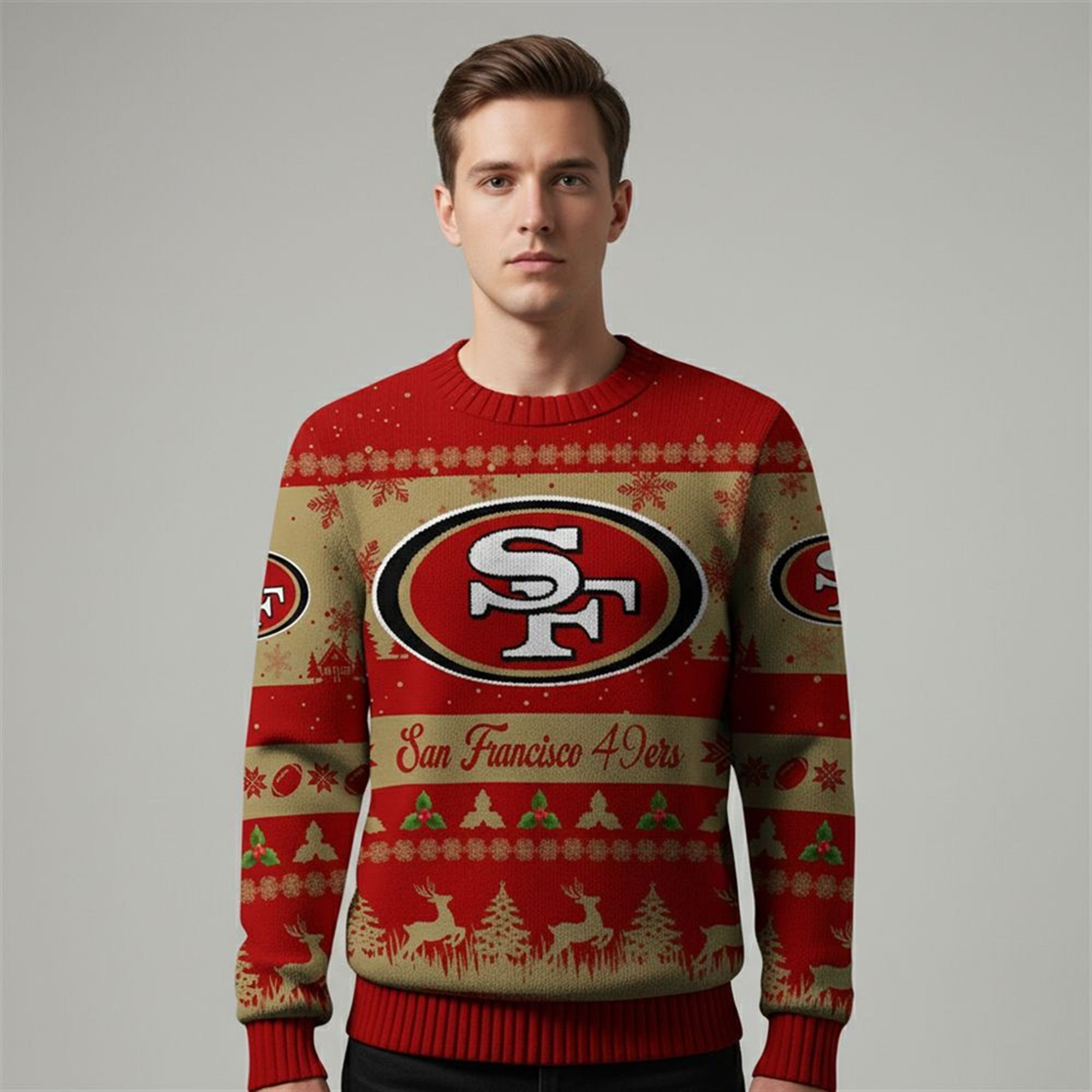 The design is anchored by the bold, instantly recognizable interlocking San Francisco “SF” logo on both the chest and the back, ensuring your allegiance is visible from every angle. The background features a sophisticated beige and scarlet color palette, mimicking a vintage knit texture. The “ugly” pattern is meticulously detailed with rows of silhouetted reindeer, snow-dusted pine trees, festive holly berries, and subtle football motifs interwoven into the snowflakes. The bright red ribbed collar, cuffs, and hem provide a sharp contrast, framing the design and keeping the warmth in during those chilly December evenings.