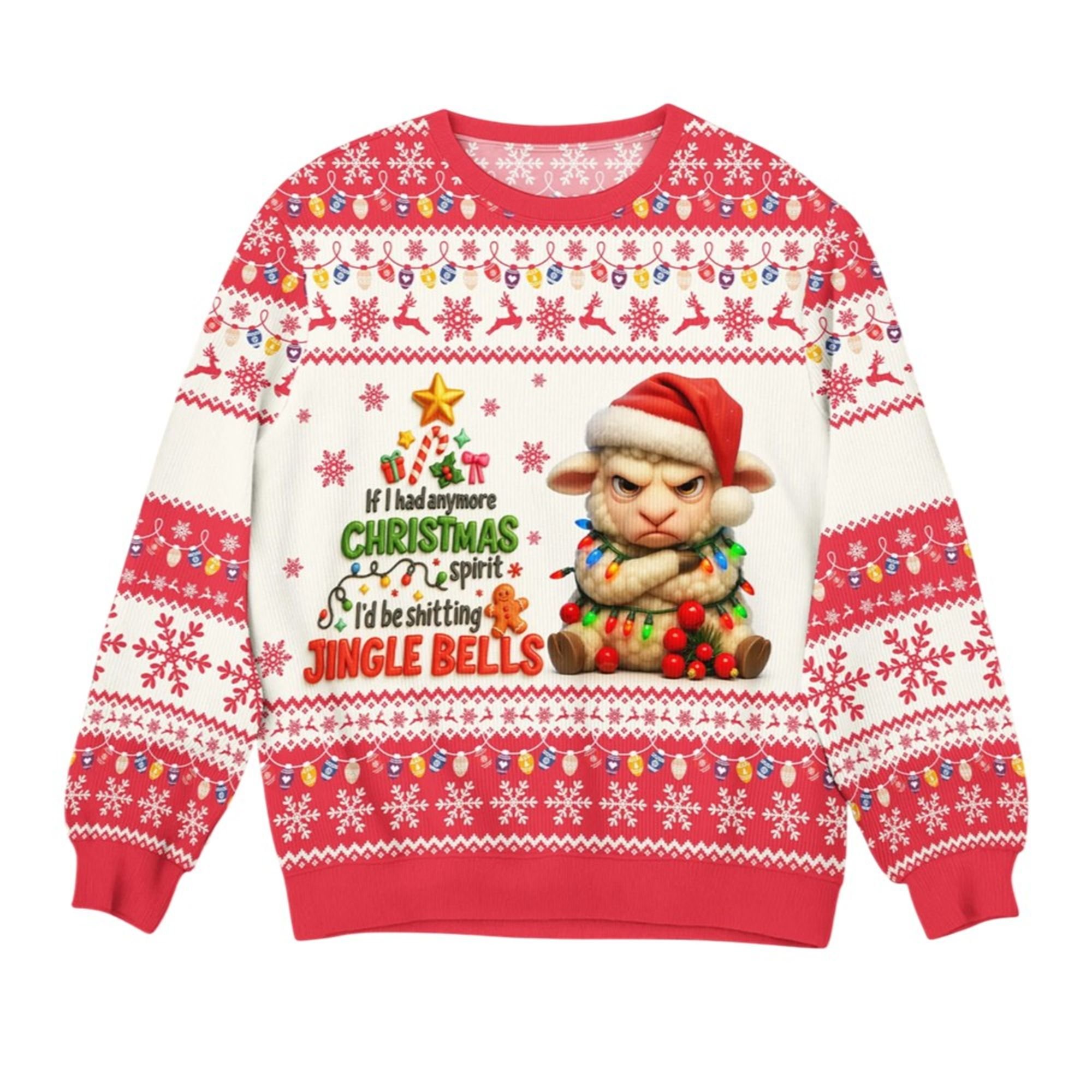 The centerpiece is a gloriously disgruntled sheep, expertly rendered with a furrowed brow and arms crossed in protest. Wrapped in a tangle of colorful Christmas lights and topped with a slightly askew Santa hat, this sheep is the embodiment of holiday burnout. The bold, unmissable text reads: “If I had anymore Christmas spirit, I’d be shitting JINGLE BELLS,” complete with festive fonts and gingerbread accents that create a perfect comedic contrast. The entire scene is set against a classic red-and-white Fair Isle pattern, featuring snowflakes, reindeer, and Christmas trees, making it authentically “ugly” in the best way possible.