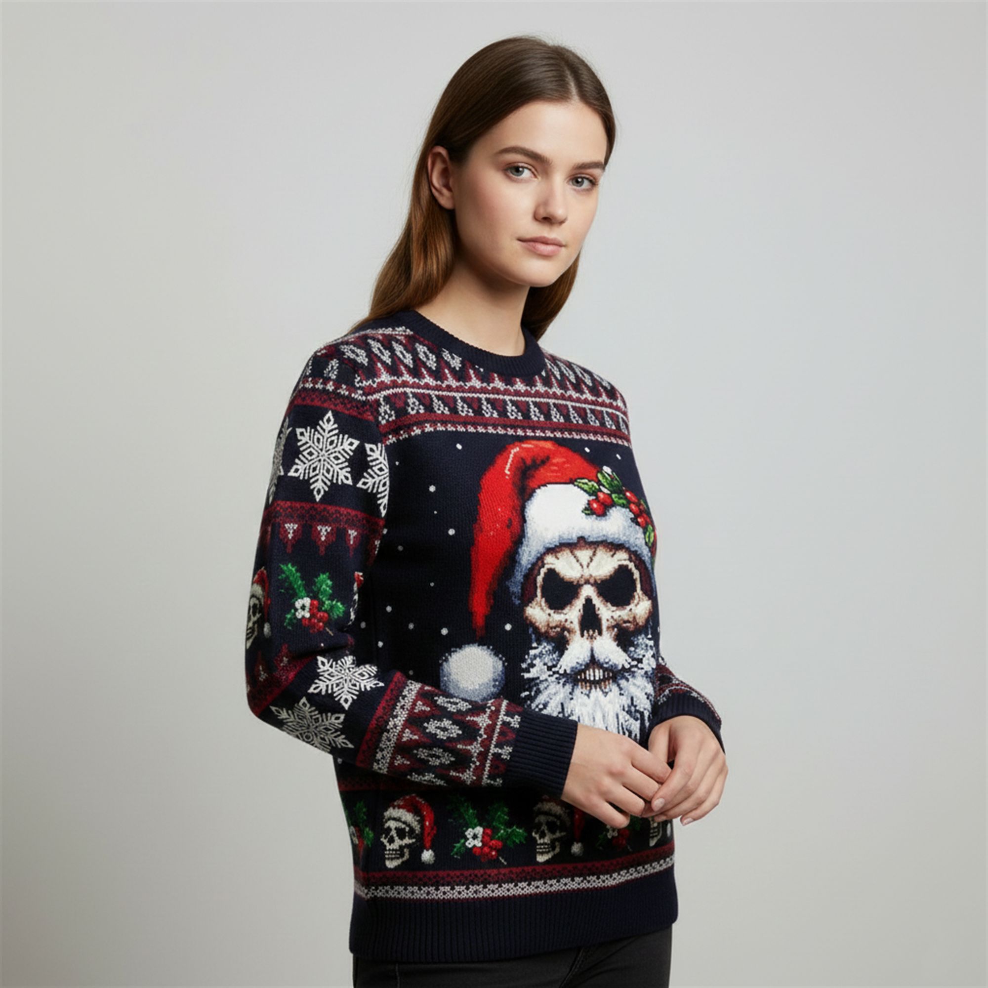 The design masterfully mimics the texture of a traditional wool knit. It is framed by classic Fair Isle patterns, including pixelated snowflakes, geometric borders, and holly berries. However, look closer at the hem and sleeves, and you’ll spot a repeating pattern of smaller skulls, tying the macabre theme together with the festive layout. It is a masterpiece of “ugly sweater” culture, elevated for the modern, edgy wardrobe.