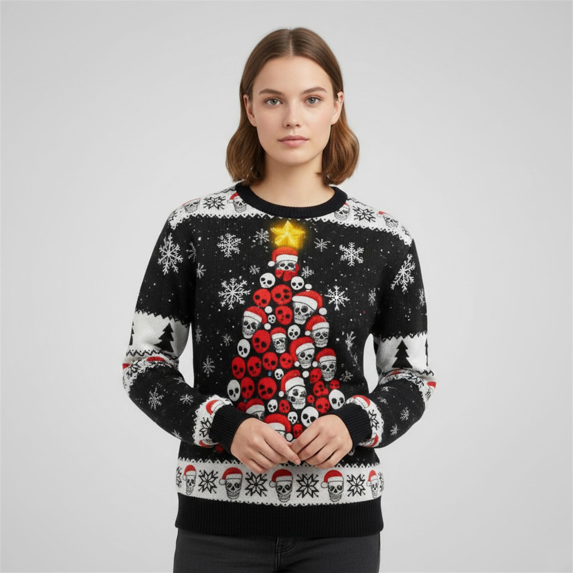 Ditch the traditional reindeer and snowflakes this year and embrace the darker side of the holidays with our Skull Tree Ugly Christmas Sweater. Perfect for the “Gothmas” trend taking over social media, this sweater features a striking Christmas tree silhouette constructed entirely from grinning skulls.