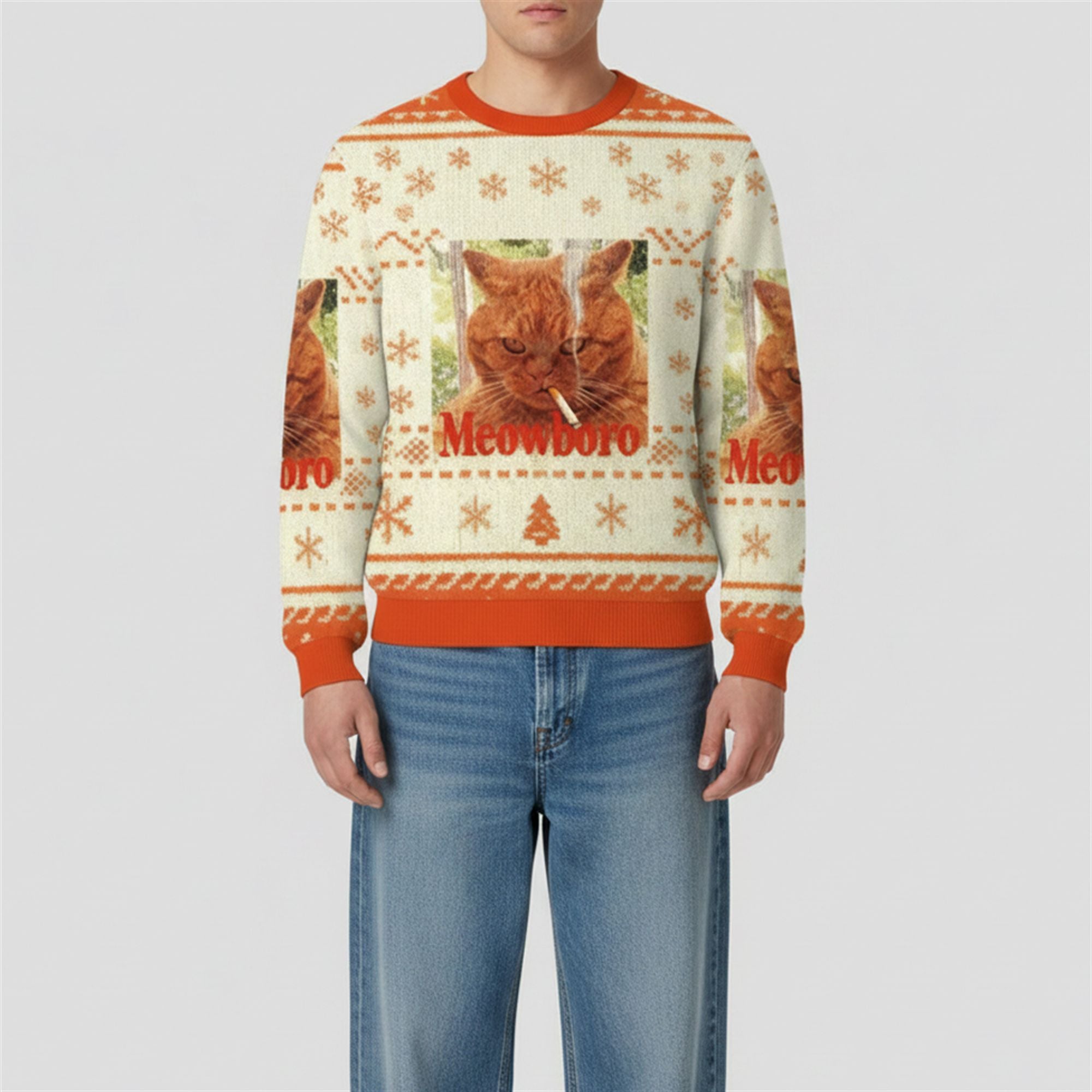 Step up your holiday wardrobe with the season’s most talked-about novelty apparel: the Meowboro Smoking Cat Ugly Christmas Sweater. Designed for the 2025 holiday season, this unique pullover blends traditional Christmas motifs—like snowflakes and pine trees—with the internet-famous gritty orange cat meme.