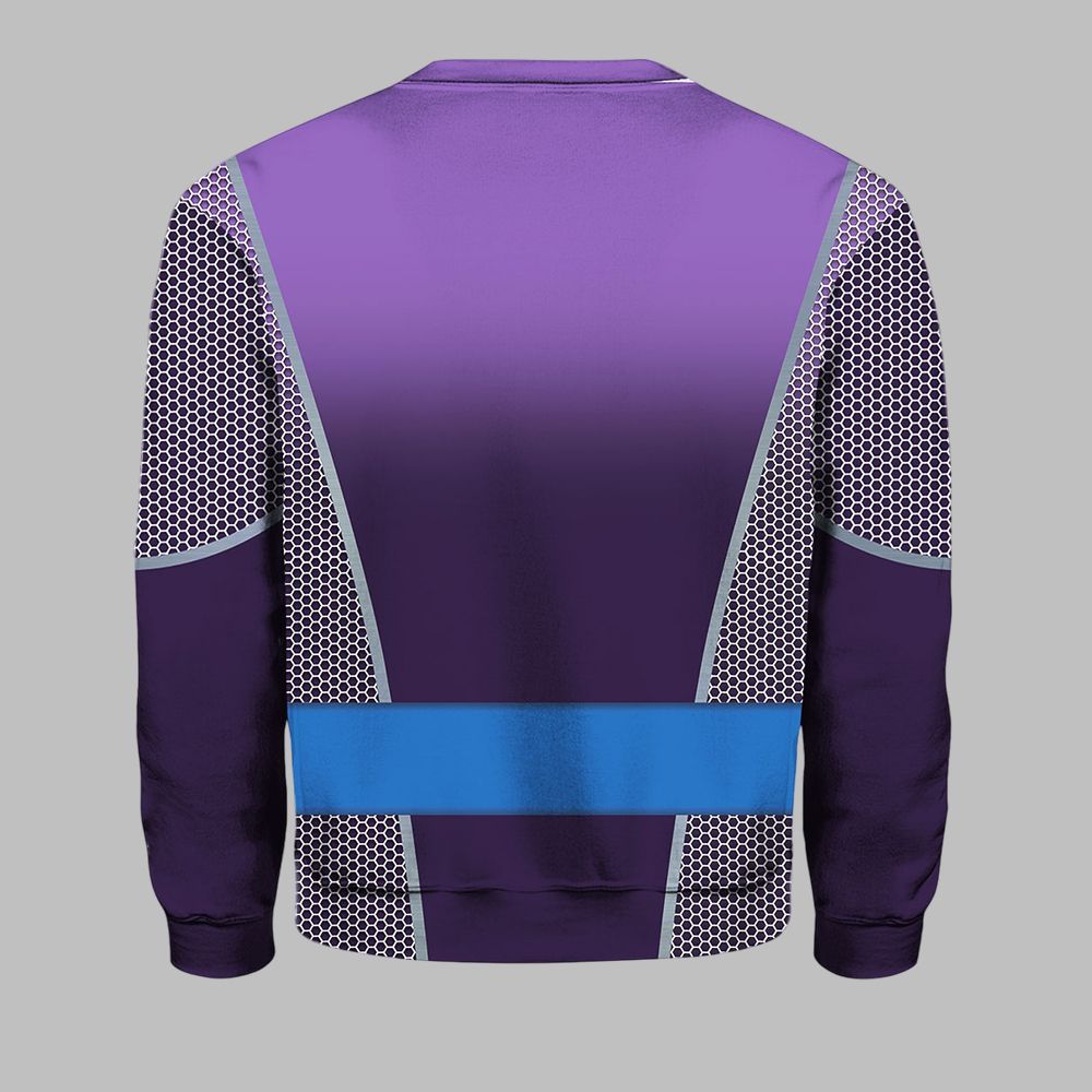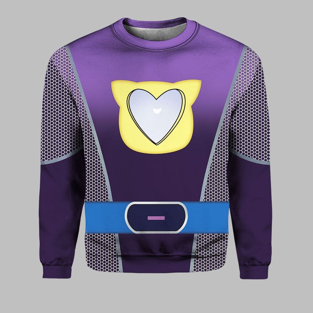 The sweater features a rich, vibrant purple base, instantly recognizable to any fan. The chest is adorned with Sparks’ signature yellow cat-head emblem, complete with the white heart symbol at its center. The design is accented with printed grey honeycomb-patterned panels on the shoulders and sides, mimicking the look of advanced superhero armor. A bold blue utility belt is printed across the waist, complete with Sparks’ central buckle, completing the transformation from kid to SuperKitty. This fun and dynamic design makes it a standout piece at any school party, family gathering, or Christmas morning celebration.