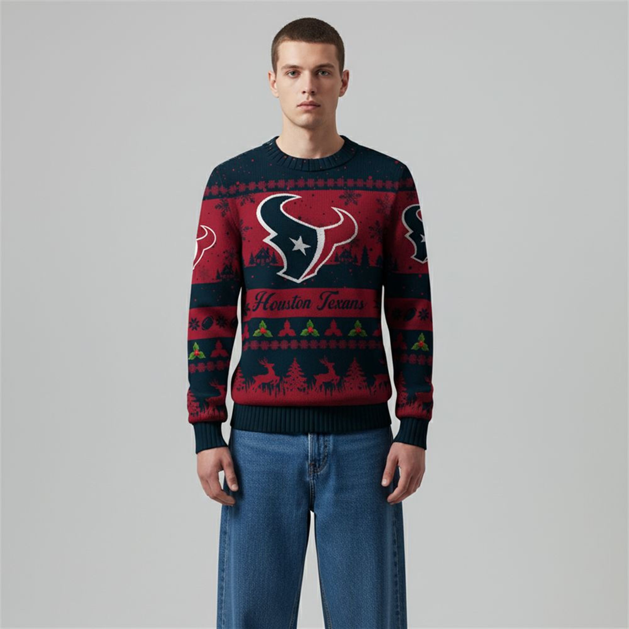 Surrounding the logo are horizontal bands of festive motifs that pay homage to traditional winter knitwear. You’ll find rows of leaping reindeer and snow-dusted pine trees, interspersed with snowflakes and geometric patterns. However, unlike your grandmother’s old knits, this sweater screams “Battle Red” attitude. The vibrant red and navy color palette stays true to the team’s colors, making it an inspired piece of fan gear that fits perfectly into your game-day wardrobe. The text “Houston Texans” is boldly woven in a classic script font across the midsection, bridging the gap between sports merchandise and festive fashion.