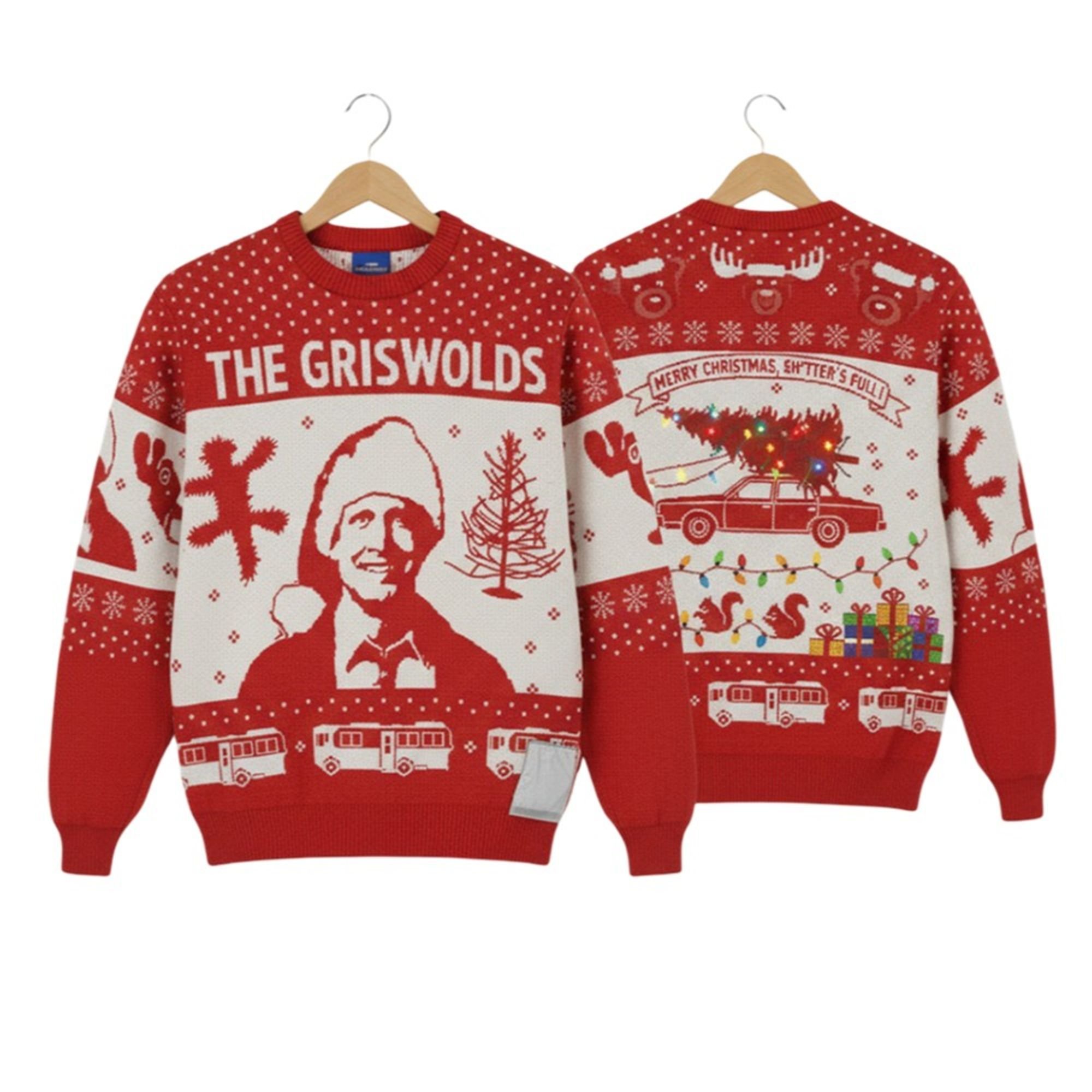 This knit sweater is a masterpiece of holiday mishaps. The vibrant red and white design instantly screams “Christmas,” but the details are pure Griswold. The front proudly displays the family name, “THE GRISWOLDS,” right above a perfectly rendered, smiling portrait of the man, the myth, the legend himselfâClark W. Griswold Jr., donning his festive Santa hat. The design is impeccably framed by classic Christmas knit patterns and a border of Cousin Eddie’s infamous RV, reminding everyone that the “blessing” has arrived.