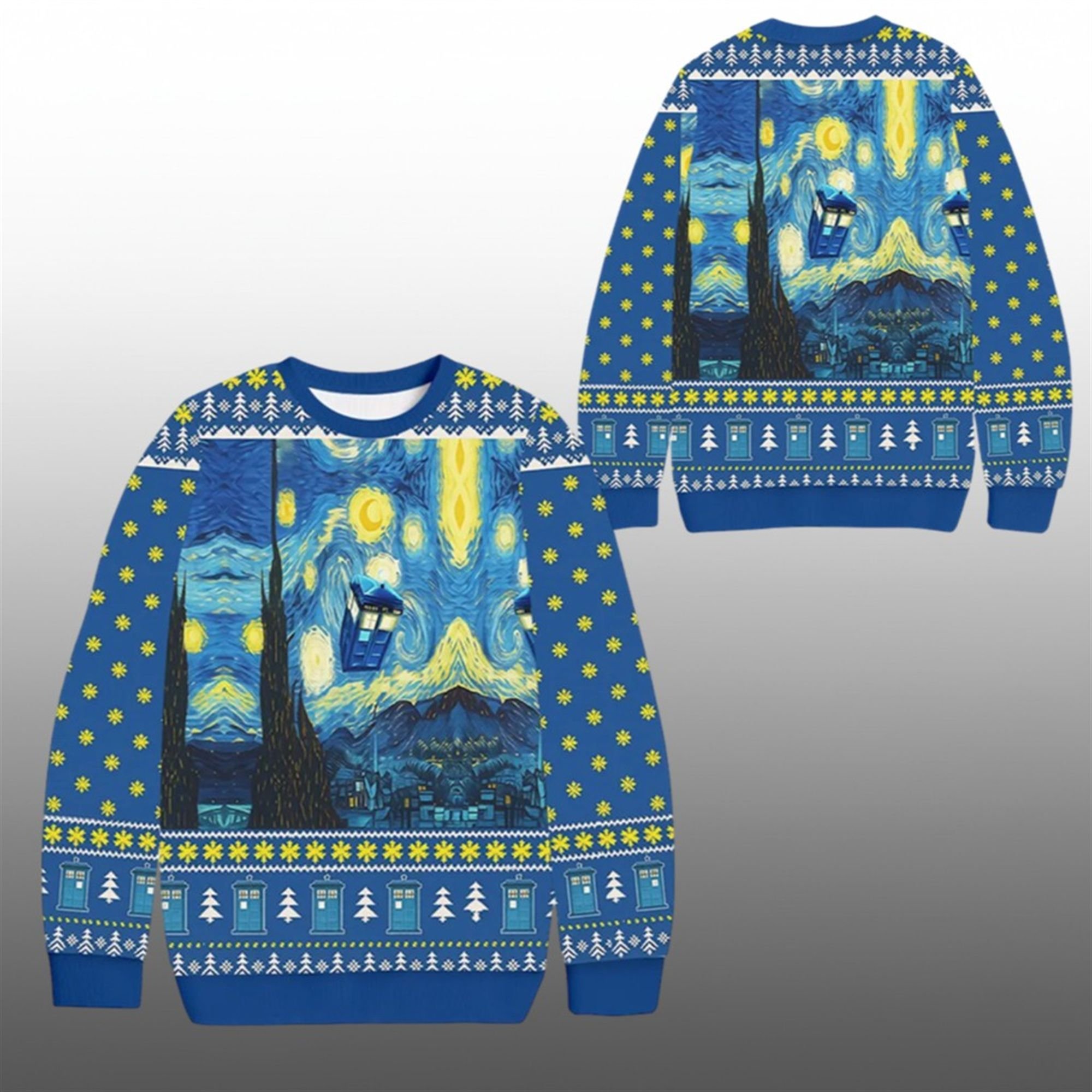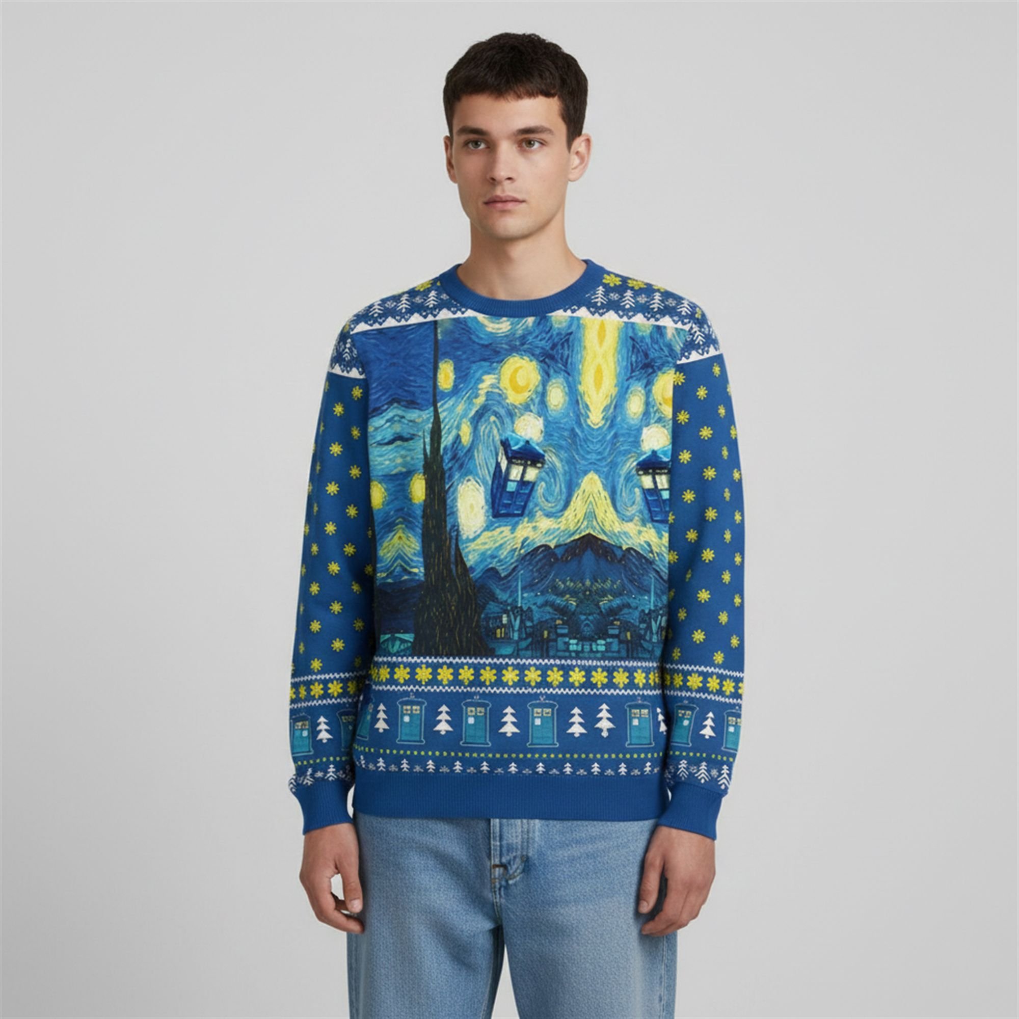 Celebrate the 2025 holiday season with a garment that transcends time—literally. The Starry Night Ugly Christmas Sweater is a visual delight that reimagines the 1889 oil canvas with a modern, geeky twist. The design features the deep blues and vibrant yellows of the original painting, capturing the chaotic yet beautiful night sky. However, keen observers will spot the distinct blue police box tumbling through the stars, a nod to the world’s favorite Time Lord.