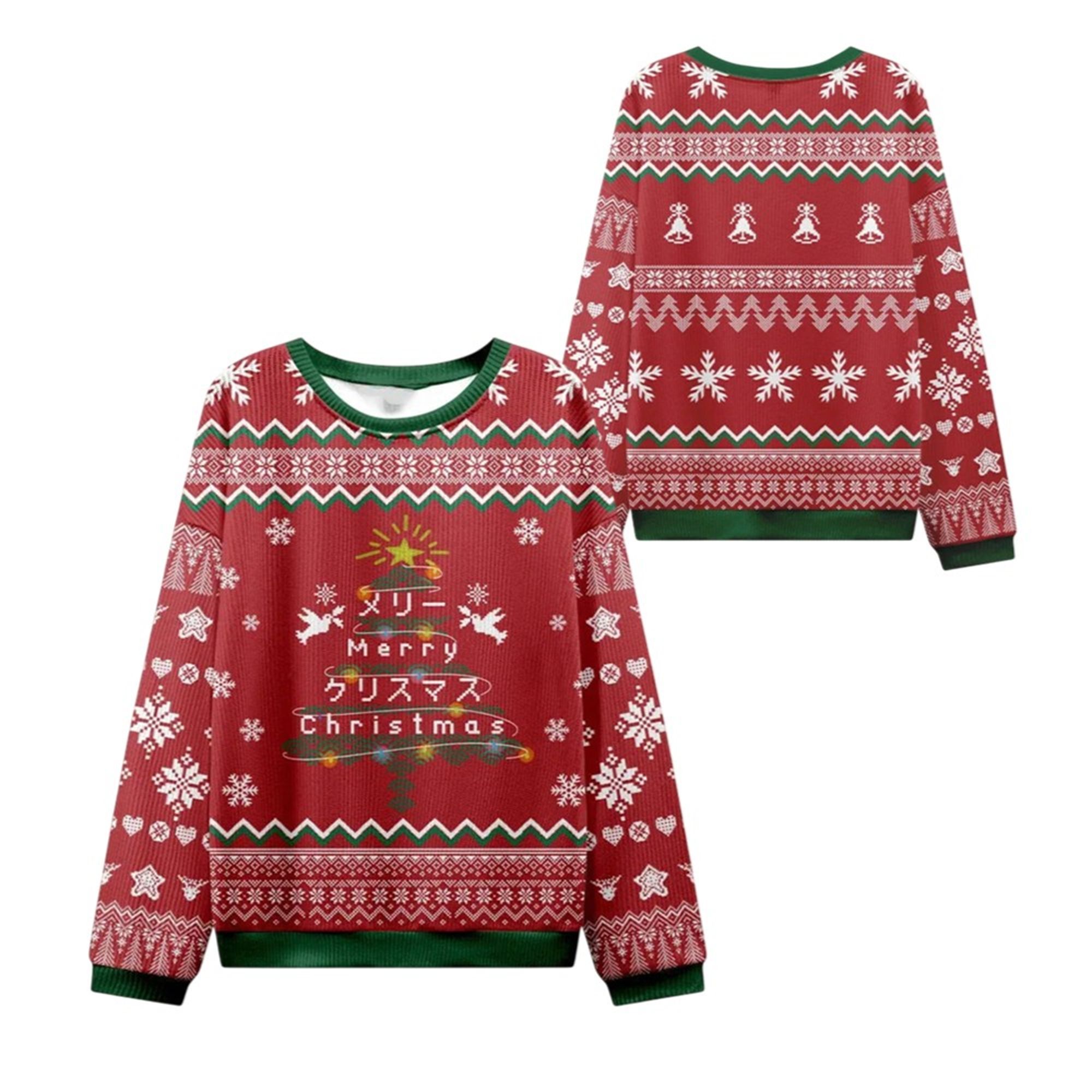 At the heart of this sweater is a beautifully stylized Christmas tree, glowing with a golden aura and topped with a radiant star. Graceful white doves flank the treetop, symbolizing peace and joy. What sets this design apart is the elegant text adorning the tree: “メリークリスマス” (Merī Kurisumasu), the Japanese way of saying “Merry Christmas,” sits proudly above the English translation. This thoughtful, multicultural detail makes the sweater a standout piece, perfect for those who appreciate global cultures or simply want a design that’s truly one-of-a-kind. The entire garment, front and back, is a festive masterpiece, covered in classic Fair Isle patterns, charming rows of Christmas bells, delicate snowflakes, and miniature evergreen trees.