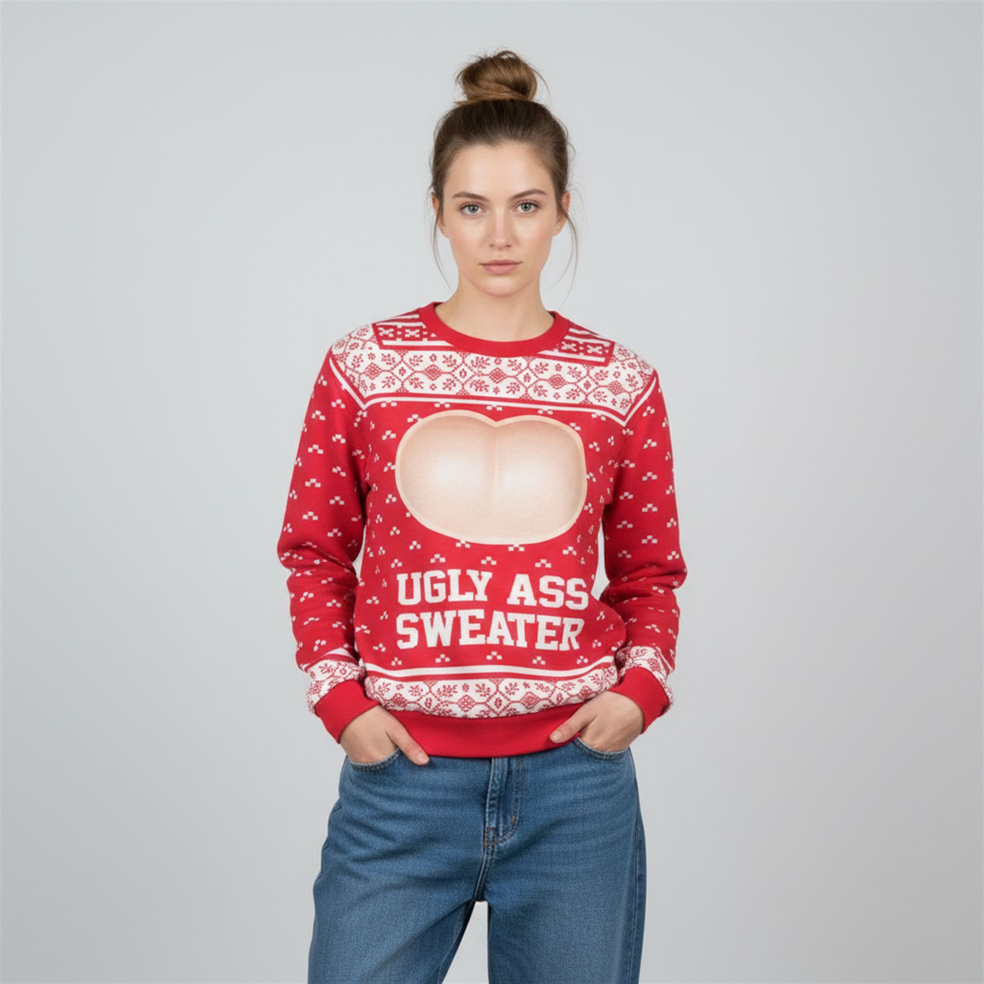 Elevate your holiday wardrobe with a sweatshirt that refuses to be ignored. The “Ugly Ass Sweater” takes the “Ugly Christmas Sweater” tradition and gives it a literal, hilarious twist. The design features a vibrant red background adorned with classic white Nordic-style stitching patterns on the shoulders and hem to maintain that festive holiday vibe. However, the main event is the center graphic: a realistic, “cheeky” display framed perfectly above the bold block text reading “UGLY ASS SWEATER.”