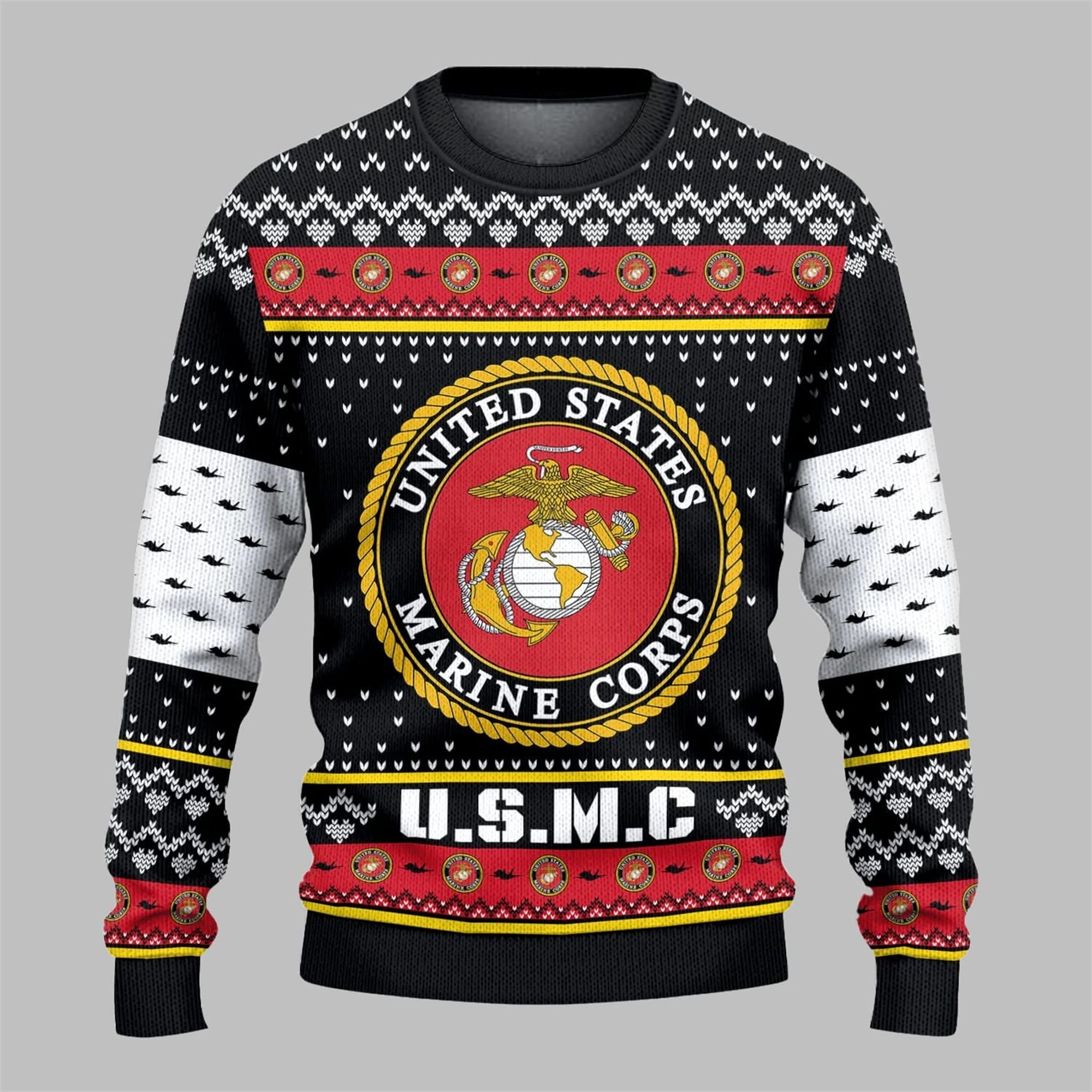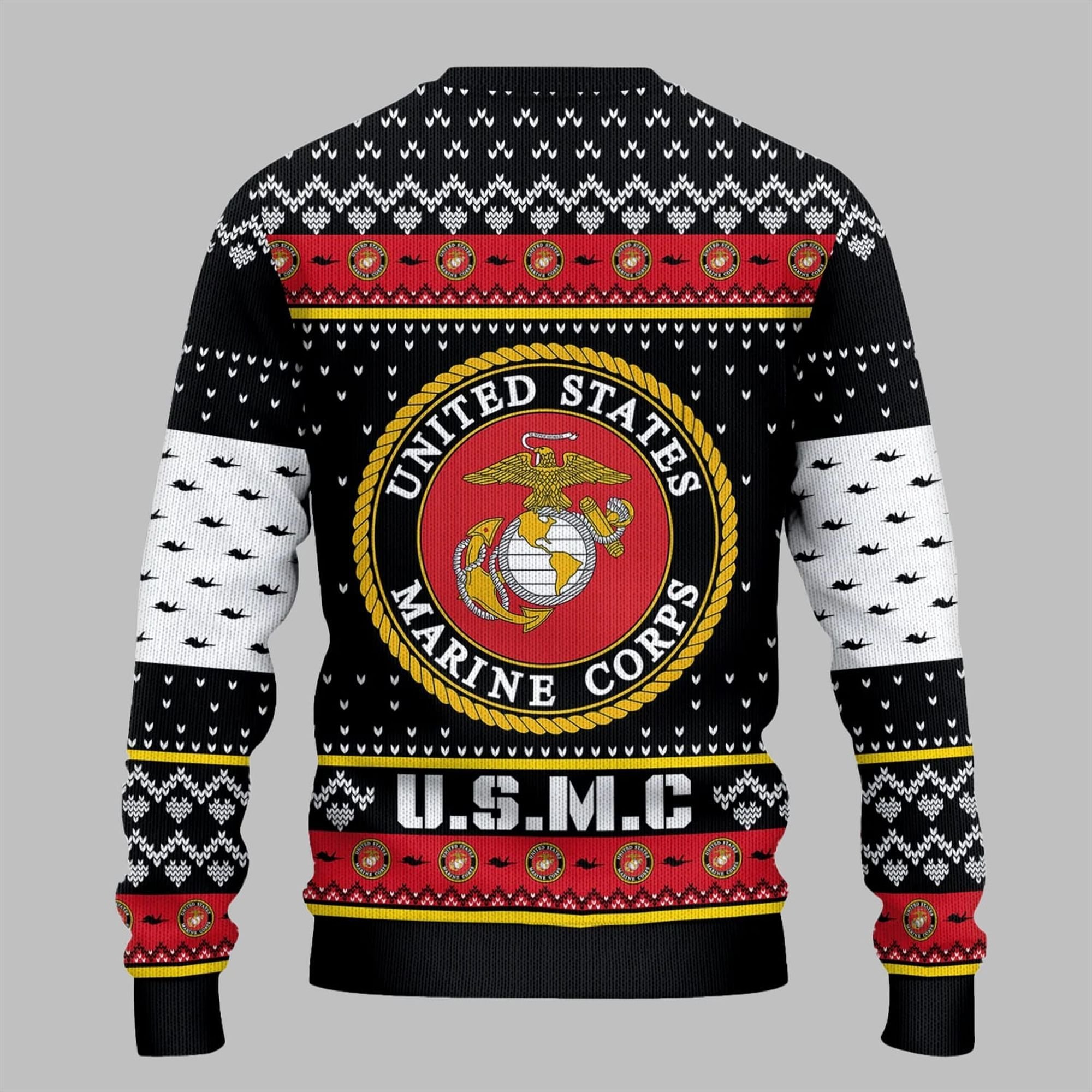 This sweater was designed with meticulous attention to detail to honor the legacy of the Marine Corps. The design features crisp, high-definition graphics that showcase the EGA emblem in all its glory, set against a backdrop of festive patterns that incorporate smaller emblems and the iconic “U.S.M.C” lettering. The color palette of black, red, white, and gold is both festive and respectful of the Corps’ traditional colors. It’s the perfect conversation starter at any holiday party, allowing you to share your connection to the Marines, whether you’re a Devil Dog yourself, a proud family member, or a grateful supporter of our armed forces.