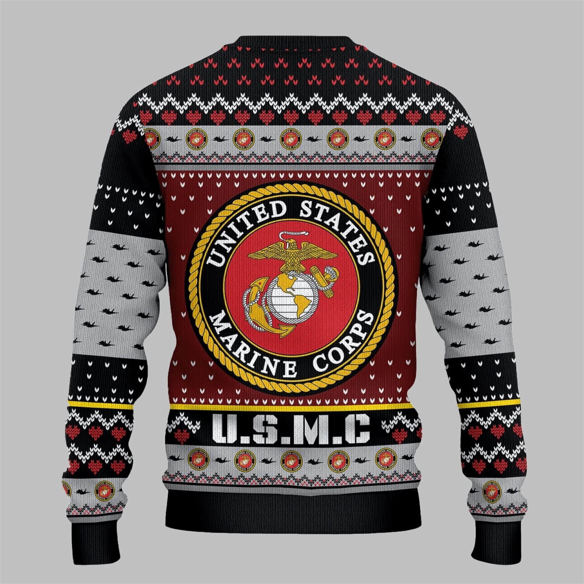 The centerpiece is the globally recognized Eagle, Globe, and Anchor (EGA) emblem, rendered in full, vibrant color and positioned prominently on the chest. Surrounding this powerful symbol are traditional holiday motifs like snowflakes and geometric patterns, seamlessly blended with subtle nods to the Corps, including repeating “U.S.M.C.” lettering and smaller emblems along the hem and cuffs. The rich crimson red, deep black, and winter gray color palette is both festive and respectful, echoing the iconic colors associated with the Marines. This isn’t just a sweater with a logo; it’s a thoughtfully crafted piece of apparel that tells a story of service, sacrifice, and holiday spirit.