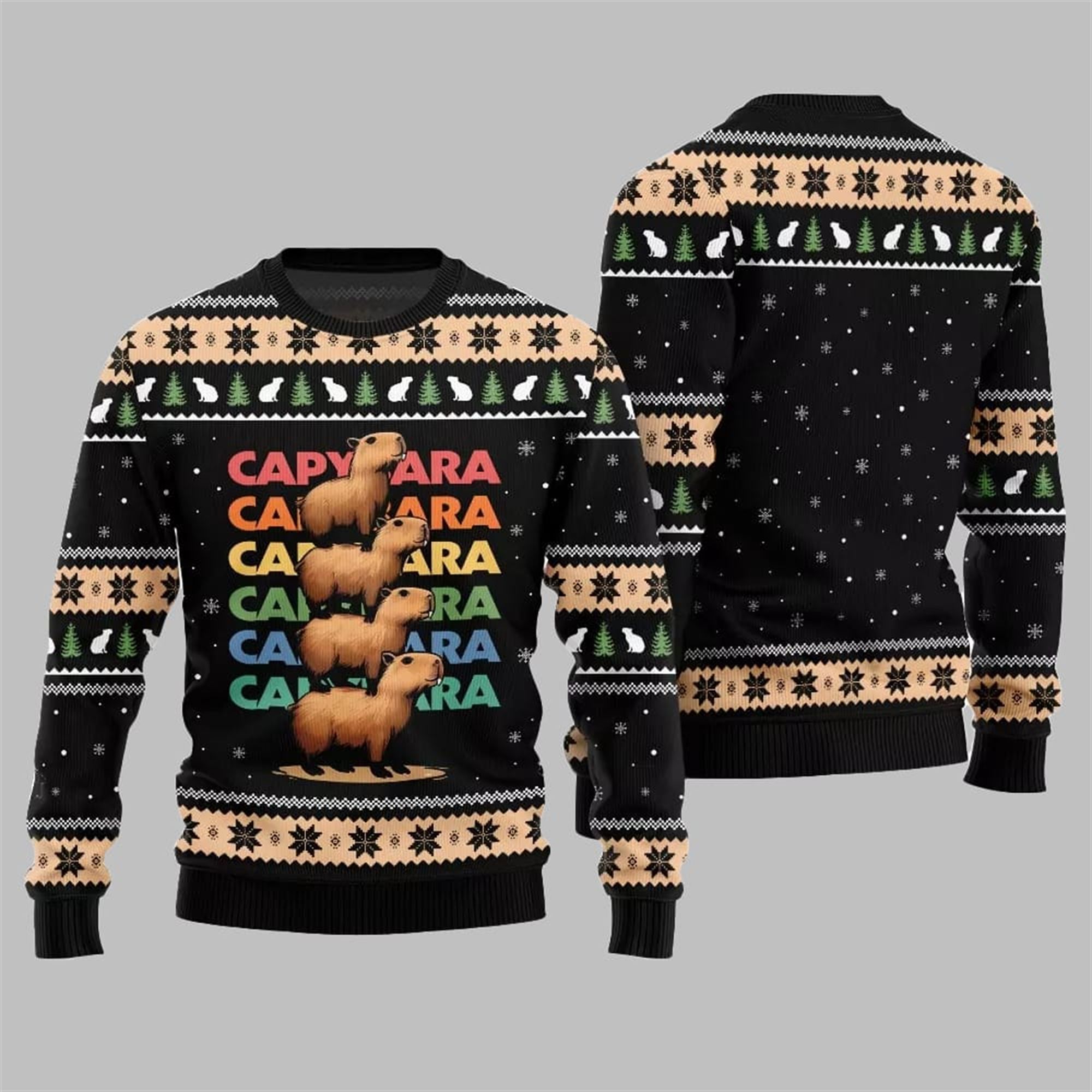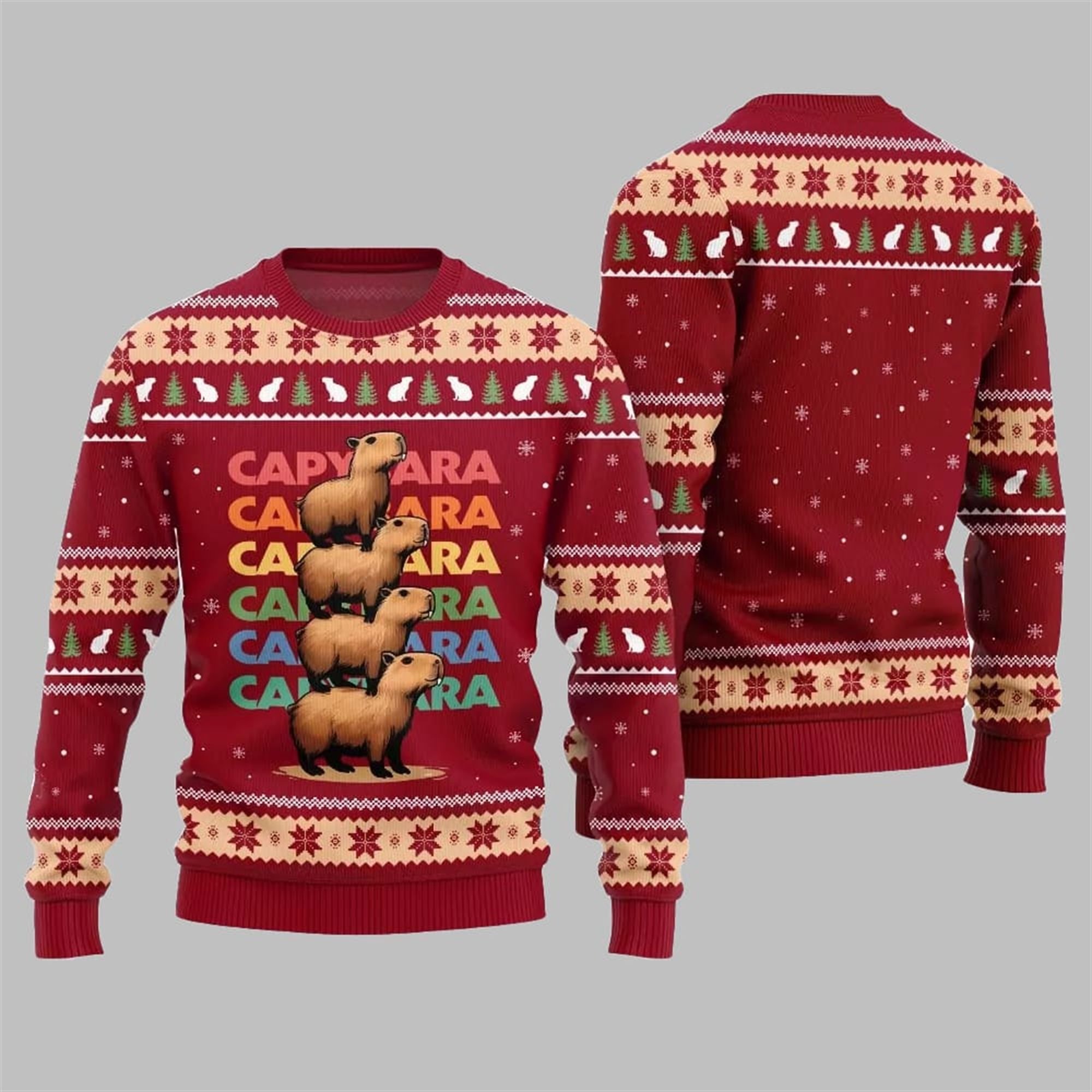 This expertly designed pullover captures the heartwarming and hilarious spirit of the internet’s favorite animal in a classic ugly sweater format. The centerpiece of the design is an adorable tower of four capybaras, stacked one on top of the other, bringing a whimsical “We Bare Bears” parody to life. Set against a vibrant royal blue background, the repeating, colorful “CAPYBARA” text creates a visually dynamic and playful effect. The entire sweater is adorned with traditional festive patterns, including crisp white snowflakes, charming Christmas trees, and rows of Nordic-inspired motifs, ensuring it perfectly fits the holiday theme while letting your quirky personality shine.