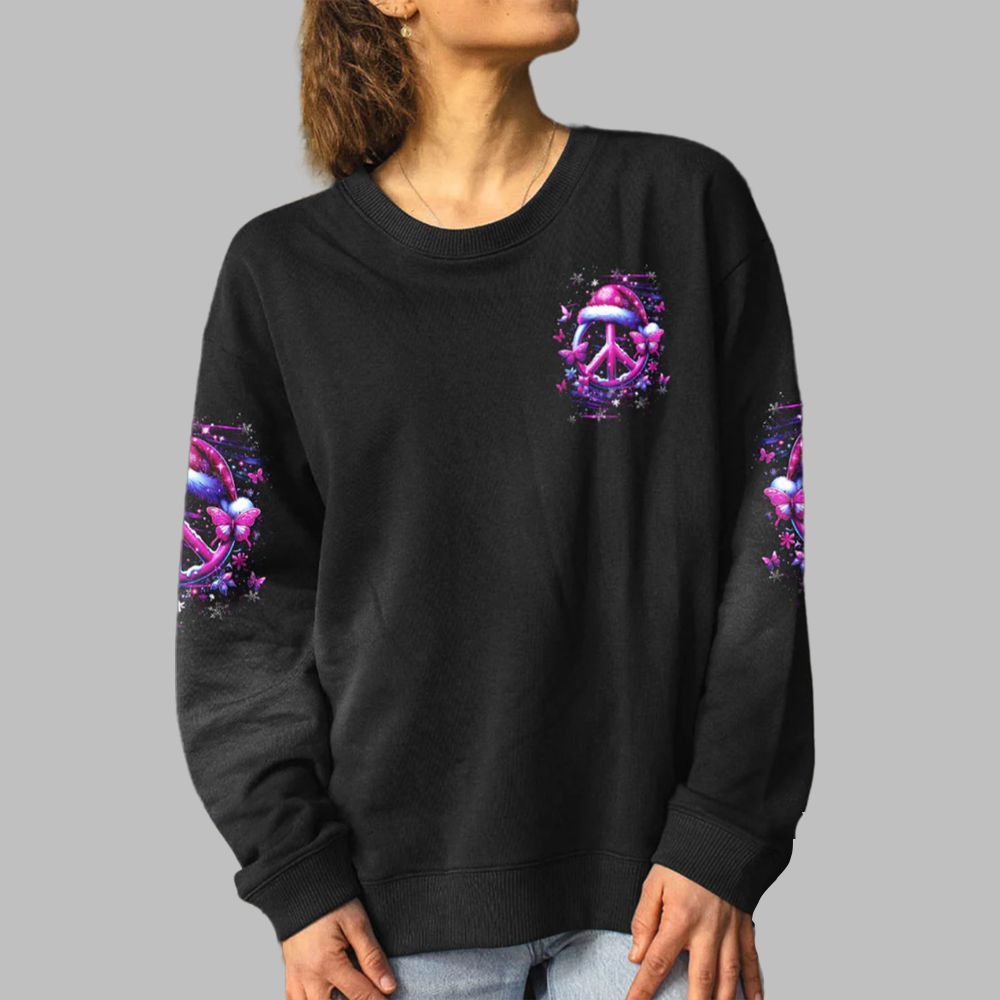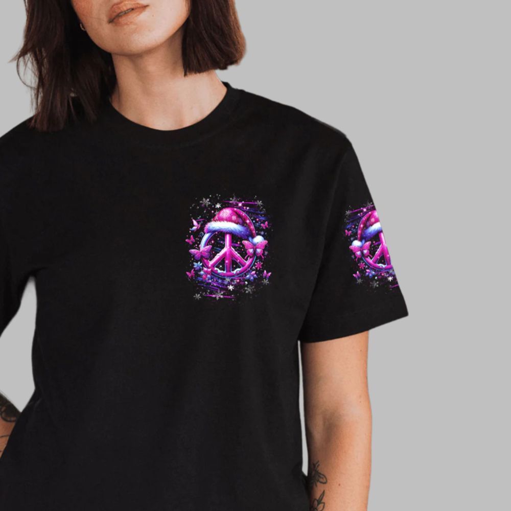 The stunning back graphic is a psychedelic celebration, featuring a large, vibrant peace sign adorned with a whimsical Santa hat. Swirling hues of cosmic purple, magenta, and blue create a captivating backdrop, sprinkled with delicate snowflakes, glowing mushrooms, and ethereal butterflies. This rich, detailed artwork makes it clear: you’re not just celebrating a holiday; you’re celebrating a legacy of freedom, love, and untamed spirit.