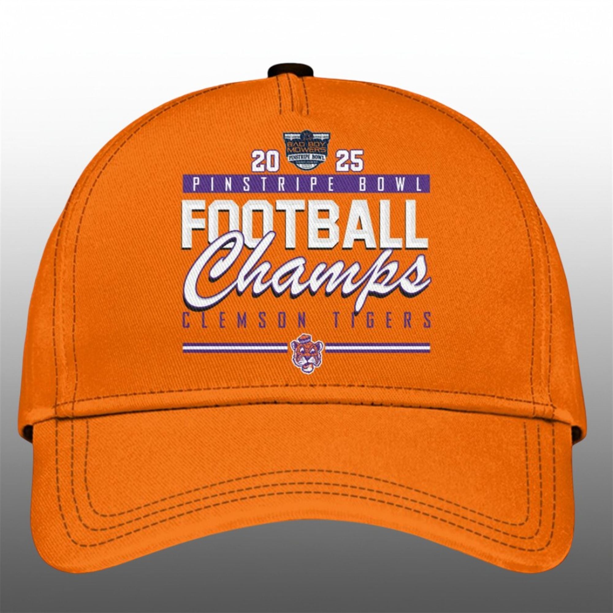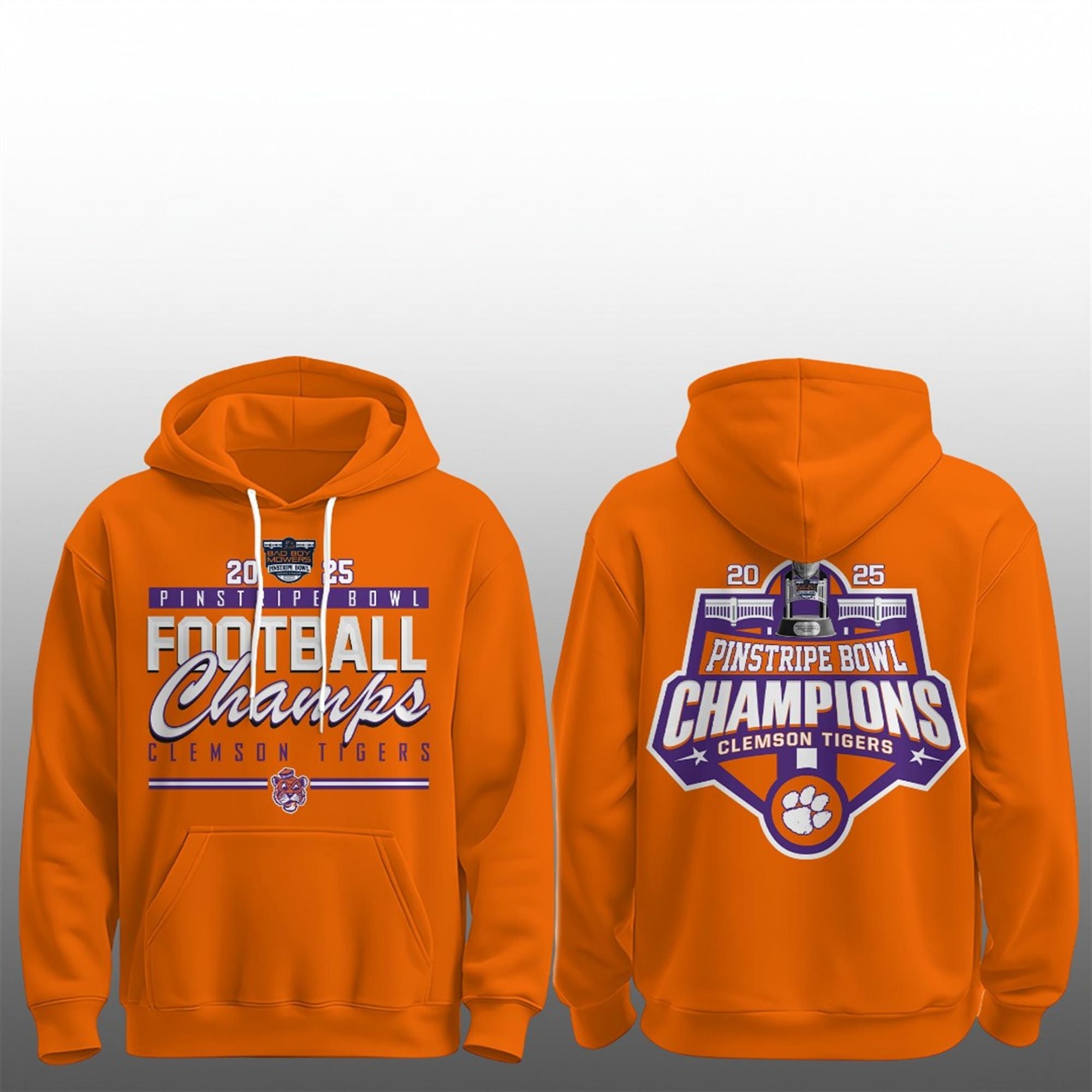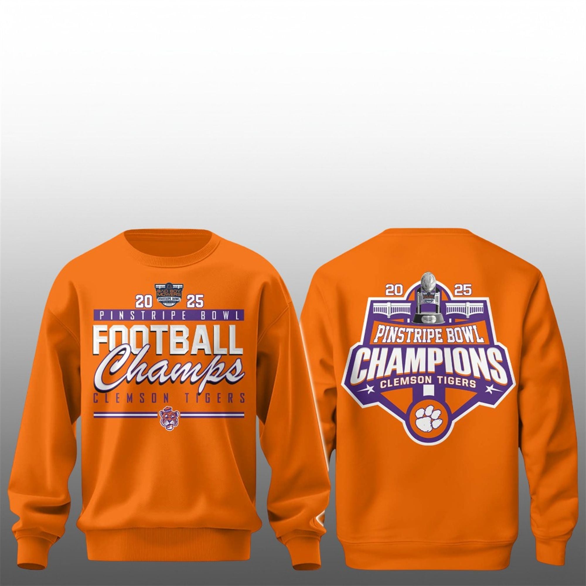 The shirt is a visually striking piece of fan apparel designed to celebrate Clemson’s victory in the annual Pinstripe Bowl. The shirt showcases a vibrant, high-definition graphic print on the front and back. The front design boldly displays “Football Champs” with the “20-25” year split, anchored by the Pinstripe Bowl logo and the Clemson Tigers mascot. The back design features a detailed illustration of the Pinstripe Bowl trophy set against the backdrop of the stadium facade, reinforcing the “Champions” title in aggressive, sporty typography.