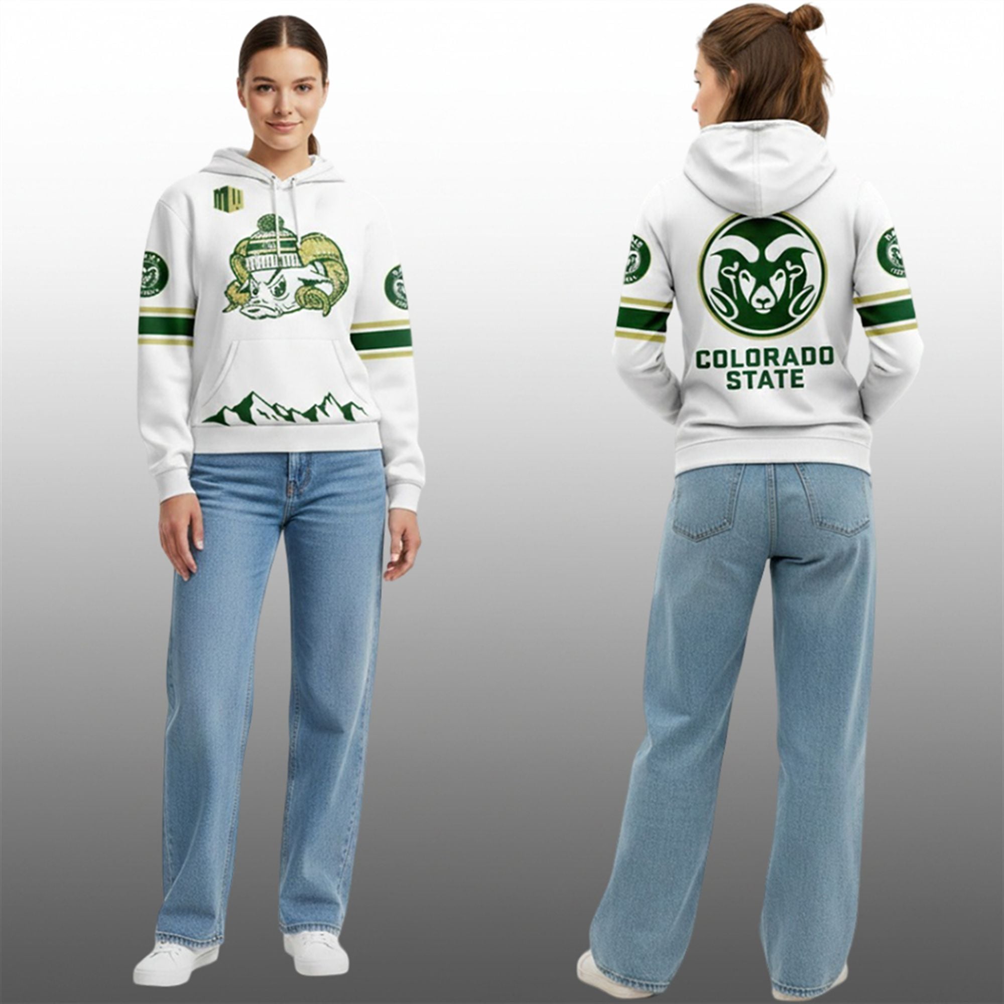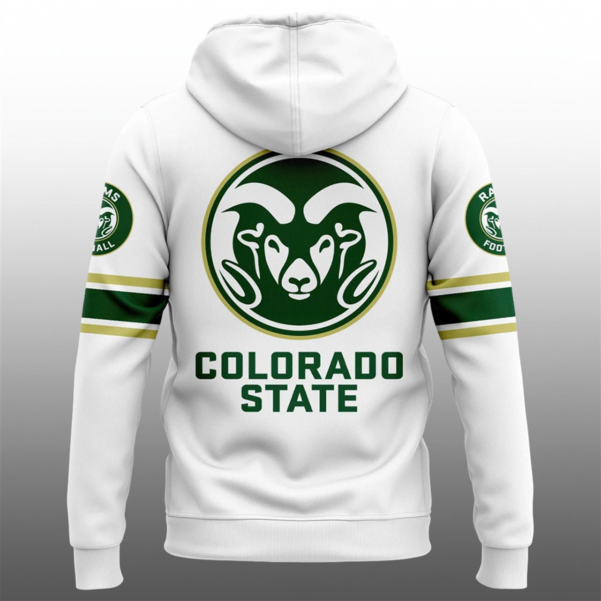 The back of the hoodie is equally impressive, featuring the massive, Colorado State Ram head logo in bold green and gold, accompanied by “COLORADO STATE” block lettering. The sleeves are finished with athletic striping and the “Rams Football” seal, ensuring that your allegiance is visible from every angle.