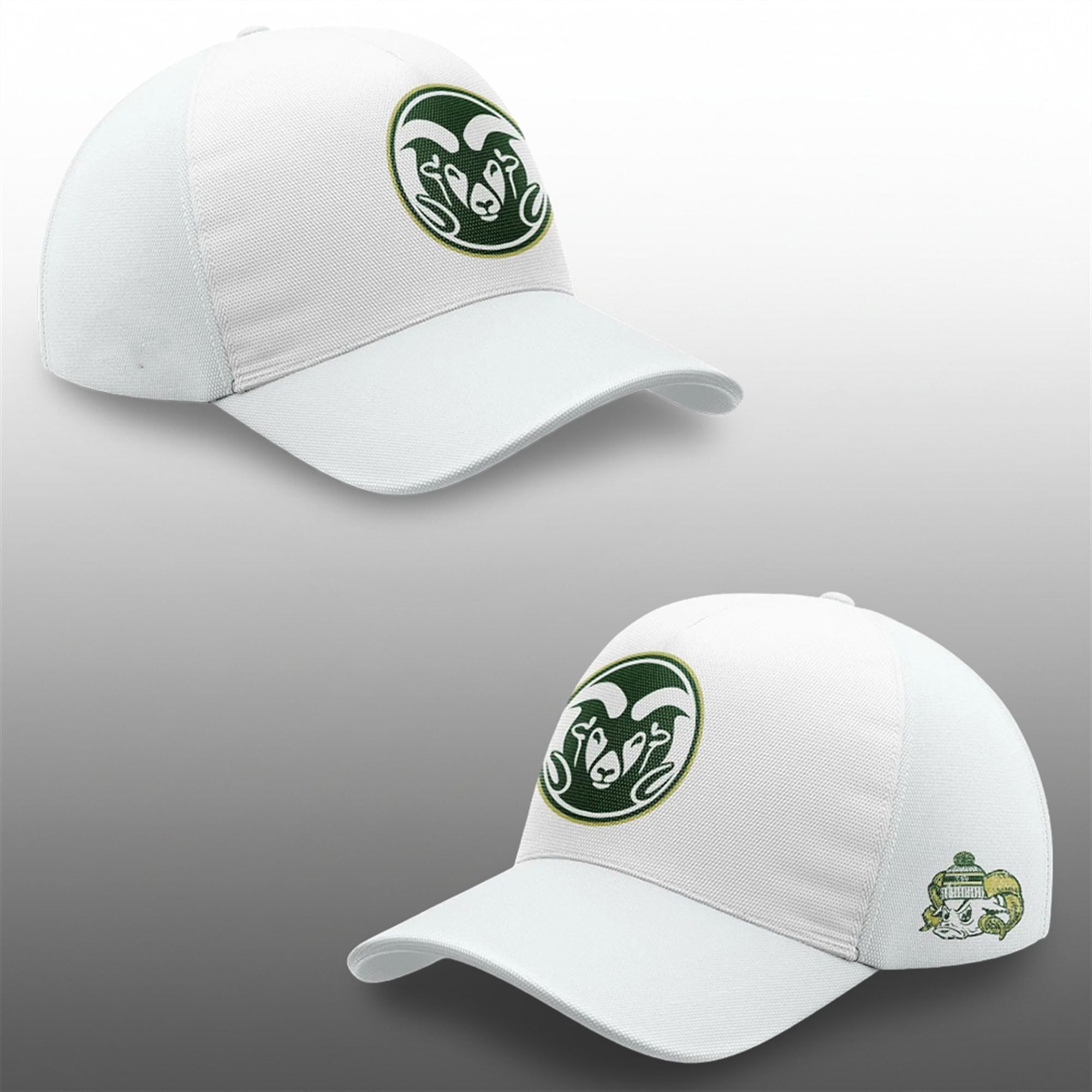 The design utilizes a crisp white base, mimicking the snow-capped peaks of the Rockies. On the front, the centerpiece is a stylized, aggressive illustration of Cam the Ram, uniquely outfitted in a winter “CSU” knit beanie. This playful yet tough addition captures the personality of the mascot while nodding to the winter season. Below the mascot, a stylized range of green Rocky Mountains wraps around the pocket area, grounding the design in Colorado’s geography.