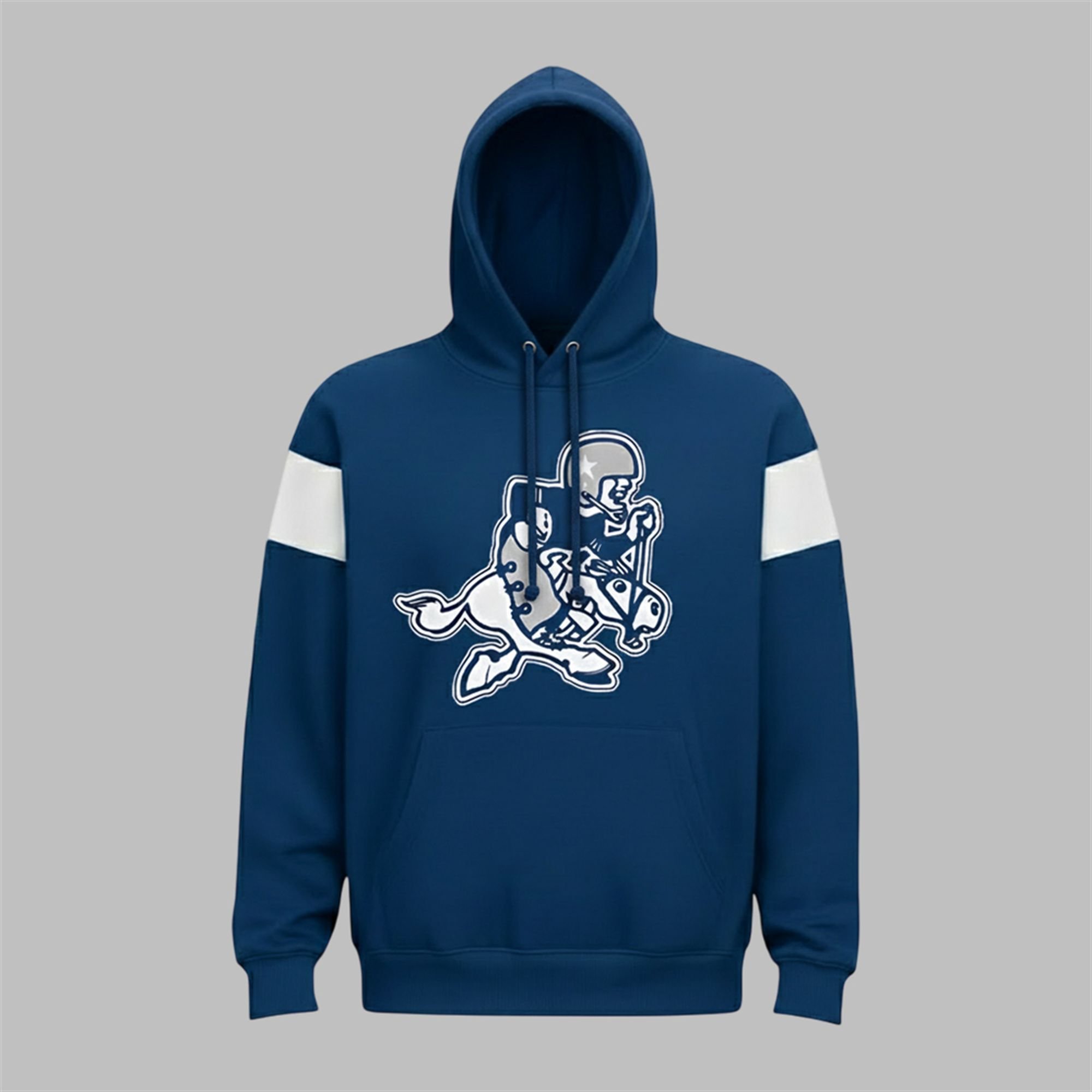 Step back in time and celebrate the rich history of the Dallas Cowboys with our “Cowboy Joe” Retro Hoodie from the 2025 Collection. This isn’t just a piece of fan apparel; it’s a wearable piece of Cowboys history, a nod to the early days of America’s Team. The vintage-inspired “Cowboy Joe” mascot, a beloved emblem from the team’s formative years, is proudly displayed on the chest, making this hoodie a must-have for any true Cowboys fan. The classic navy blue color, accented with bold white sleeve stripes, captures the timeless aesthetic of vintage sportswear.