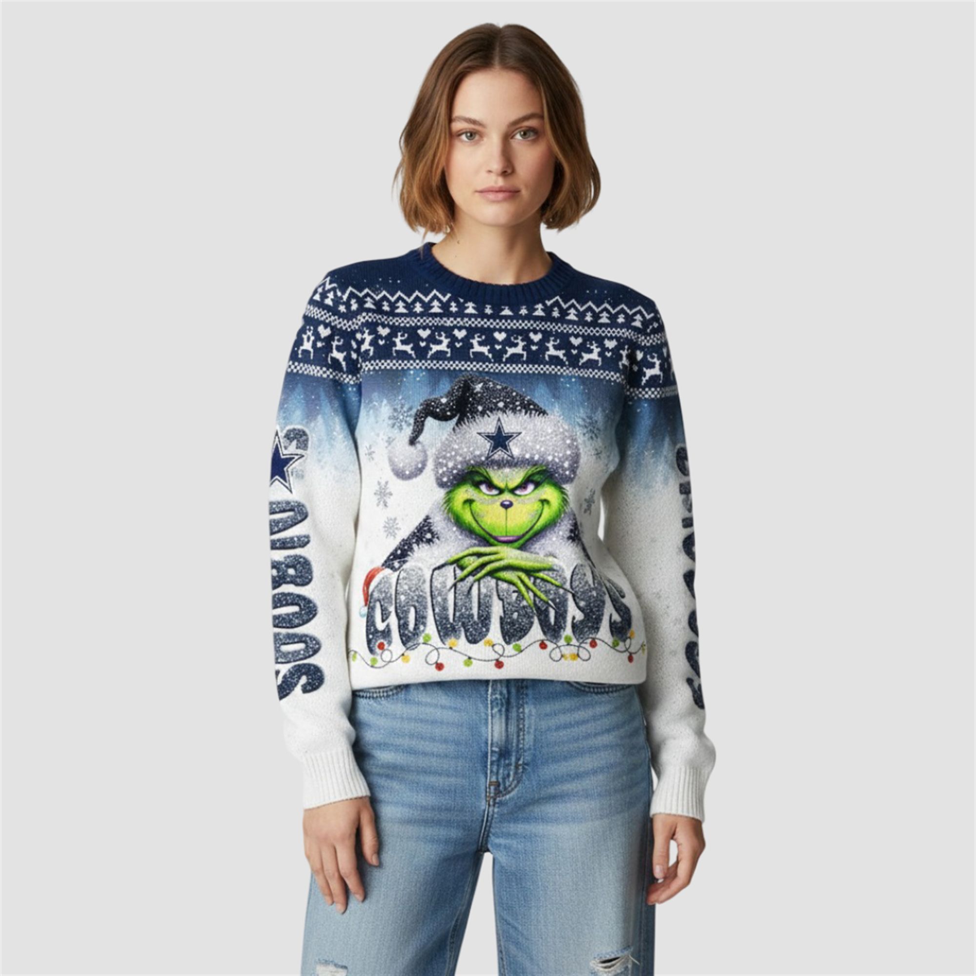 The design features a vibrant, snowy gradient background that fades from deep navy to winter white. At the center, the beloved holiday anti-hero—The Grnch—smirks mischievously while wearing a Santa hat emblazoned with the legendary Dallas Star. Beneath him, the word “COWBOYS” is rendered in a glittering, icy font, draped in a festive string of Christmas lights. The shoulders are accented with traditional Nordic winter patterns featuring reindeer and snowflakes, grounding this modern design in classic holiday tradition.