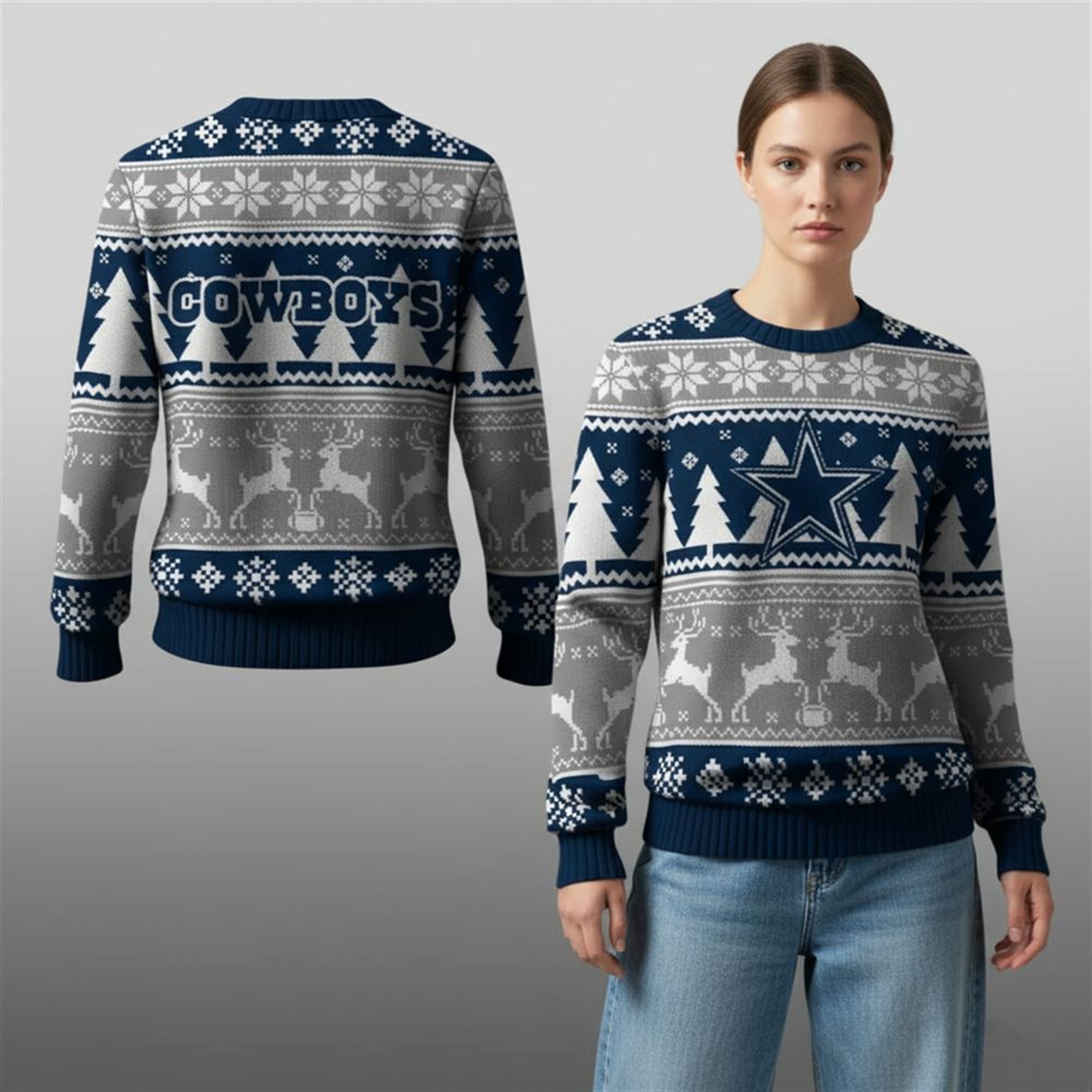 The design features a sophisticated tri-color palette of the team’s signature Navy Blue, Metallic Silver-Grey, and White. The front of the sweater is dominated by the iconic Dallas Cowboys Star logo centered on the chest, flanked by winter-ready pine trees.