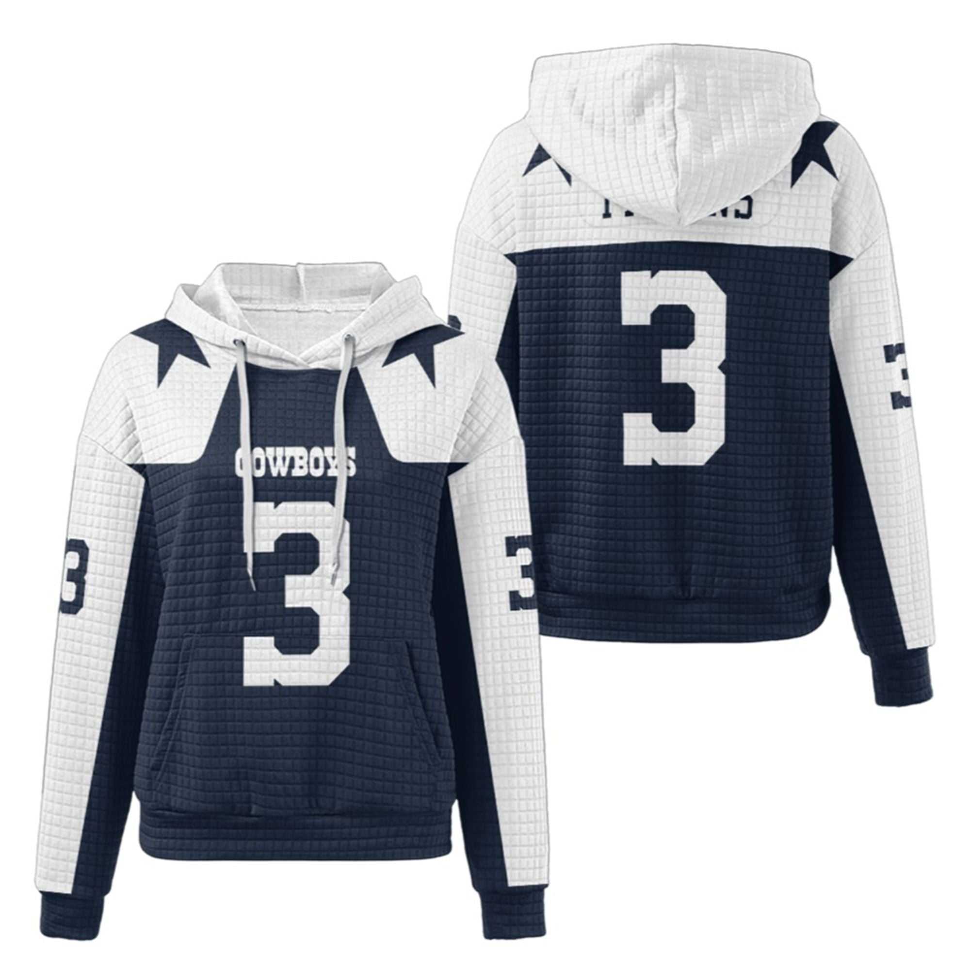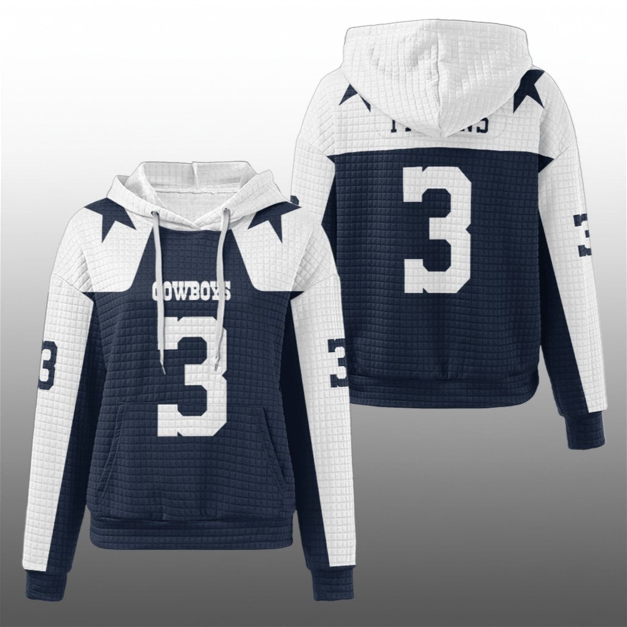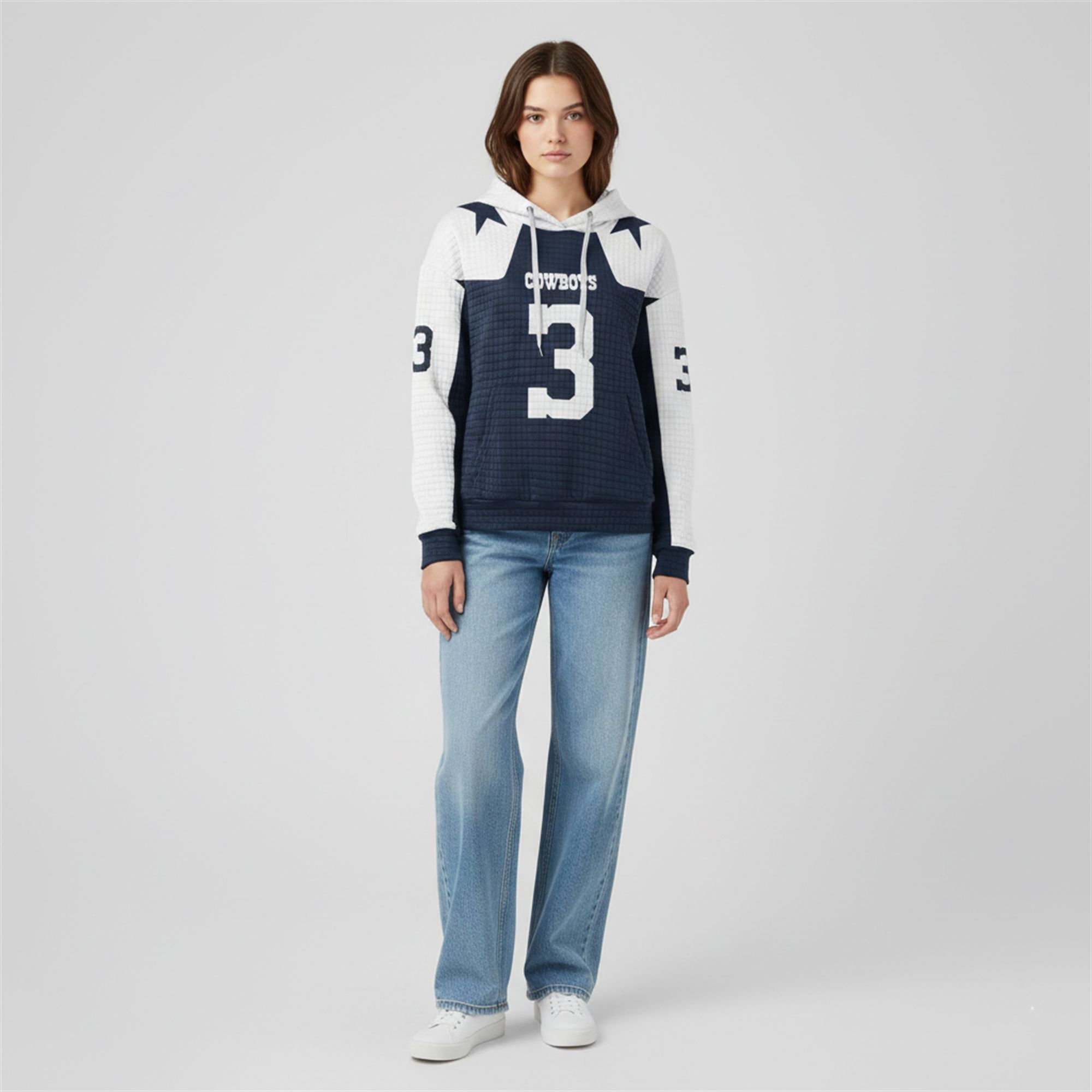 Featuring a distinct quilted waffle-knit texture, this hoodie offers a sophisticated tactile experience that stands out in a sea of flat cotton jerseys. The design showcases the iconic Navy Blue and White color block scheme, punctuated by the legendary Cowboys Star on both shoulders. Centered with a bold Number 3—representing the explosive new era of the Dallas offense—this hoodie is engineered for those who want to rep the 2025 season in style. Whether you are cheering from the stands at AT&T Stadium or hosting a watch party, this hoodie delivers warmth, durability, and undeniable swagger.