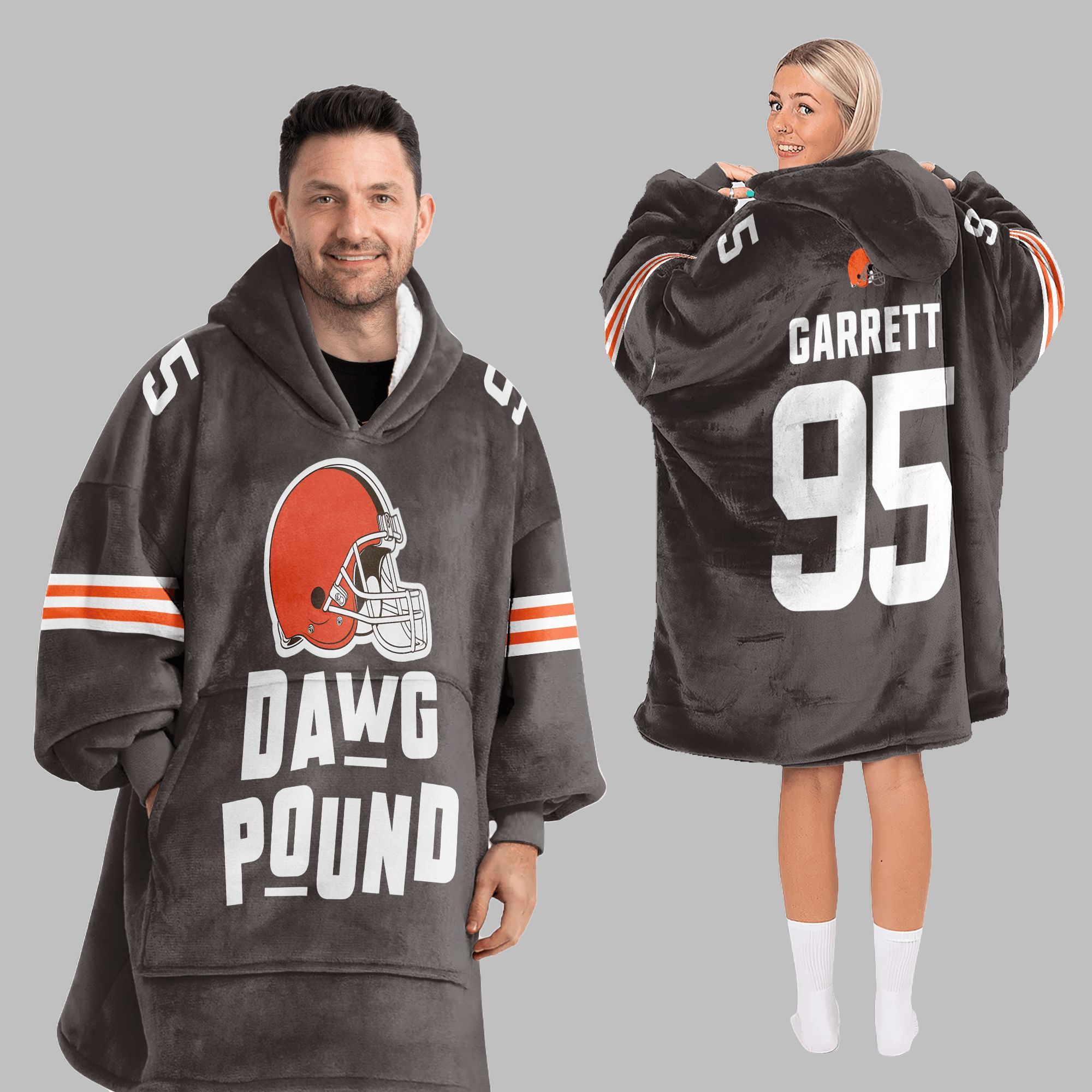This is more than just a brown blanket. It’s a statement of loyalty. The front proudly features the classic Browns helmet logo and the iconic “DAWG POUND” text in bold, athletic font. The back is a full tribute to one of the most feared defenders, Myles Garrett, featuring his name and #95 in jersey-style print. Complete with team-colored orange and white stripes on the sleeves and shoulder numbers, this hoodie lets you represent your favorite player and your team with pride from every angle.