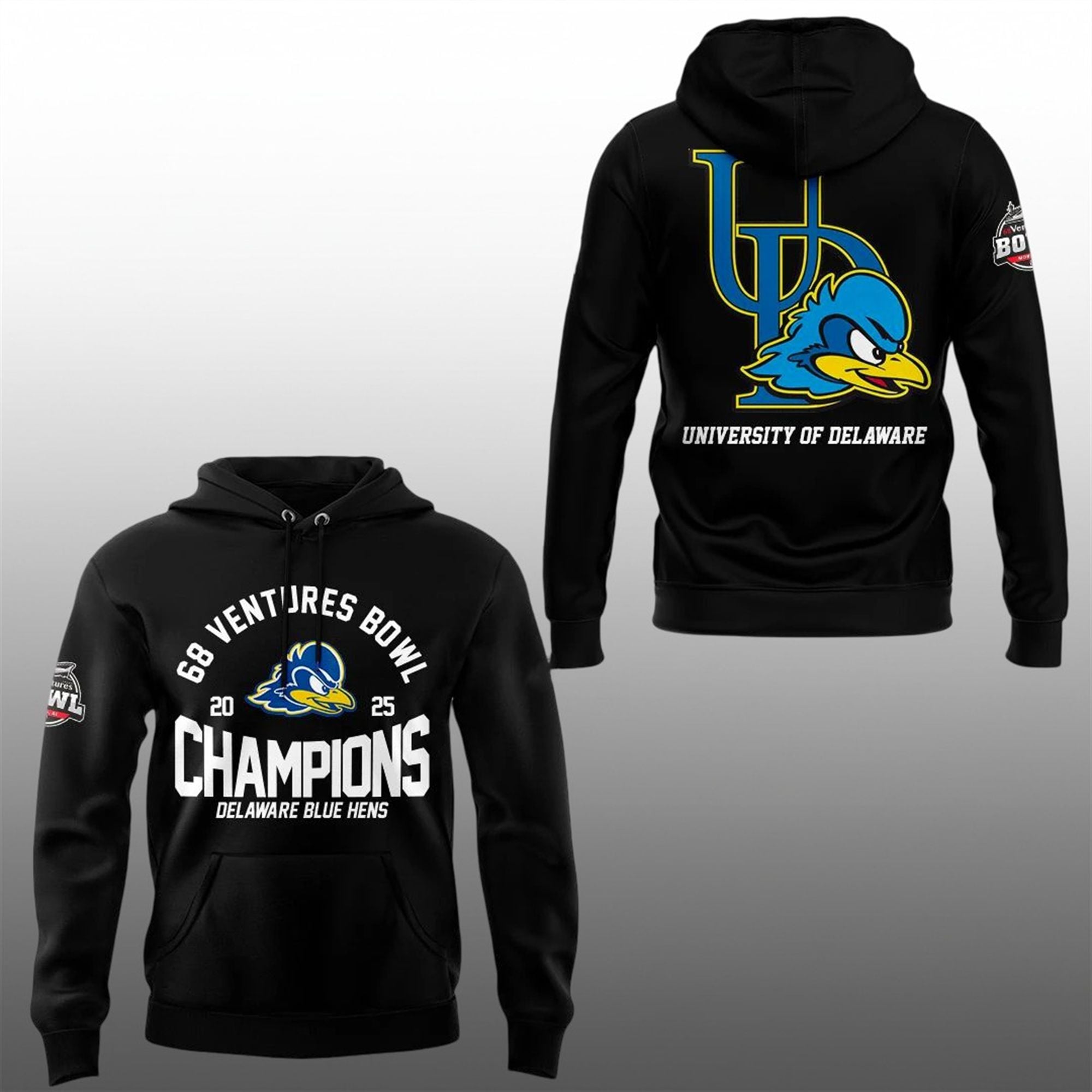 This isn’t generic fan gear; it is a specific commemoration of the December 2025 victory. The front features a dynamic “Champions” layout flanked by the year “2025” and the 68 Ventures Bowl insignia, while the back displays a massive, high-impact University of Delaware graphic that leaves no doubt about your allegiance.