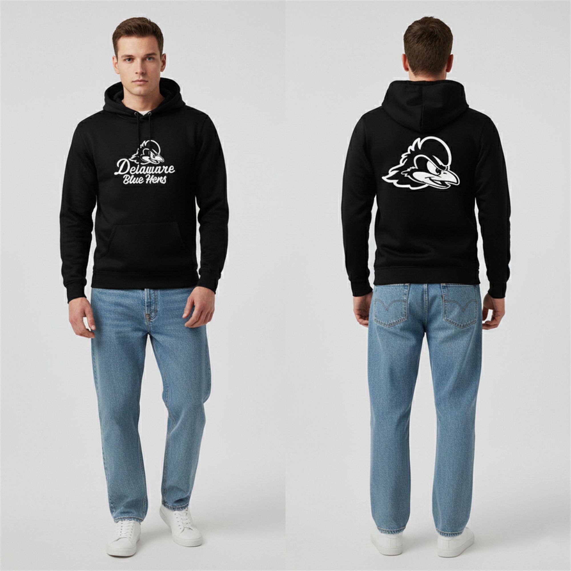 The front of the shirt features the iconic Fightin’ Blue Hen mascot head rendered in crisp white, perched aggressively above the vintage-inspired script text reading “Delaware Blue Hens.” The back mirrors this intensity with a larger, oversized mascot logo, ensuring your fandom is visible from every angle. This dual-sided print maximizes visual impact, making it a standout piece at tailgates, alumni gatherings, or holiday parties.