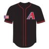 This 2025 Diamondbacks Puerto Rican Heritage Celebration Jersey Giveaway offers fans a special way to connect with both the Arizona Diamondbacks and Puerto Rican heritage. The jersey features a sleek black base, providing a modern and bold backdrop for the design elements. Contrasting red piping elegantly lines the button-down front, collar, and sleeve cuffs, echoing the Diamondbacks’ familiar color scheme while adding a vibrant touch. The iconic Diamondbacks “A” logo is prominently displayed on the left chest, instantly recognizable to any baseball fan